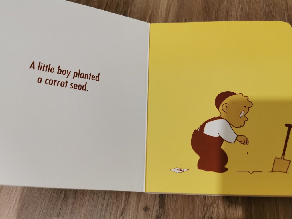 故事很简单, 整个故事就是围绕一个小男孩种胡萝卜的故事, 有一个小男孩,种了一颗胡萝卜种子, 他的爸爸、妈妈、哥哥都告诉他胡萝卜种子是不会发芽的, 过了一段时间,他们还是劝小男孩放弃。