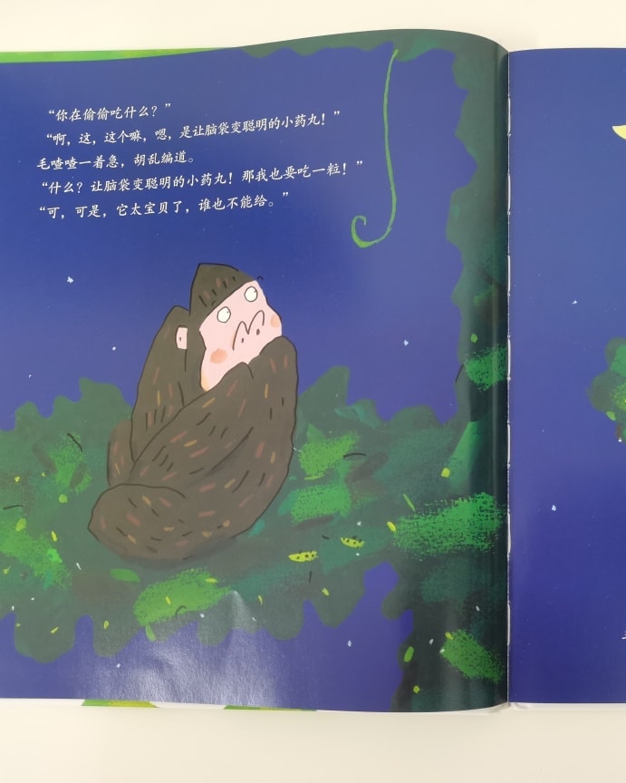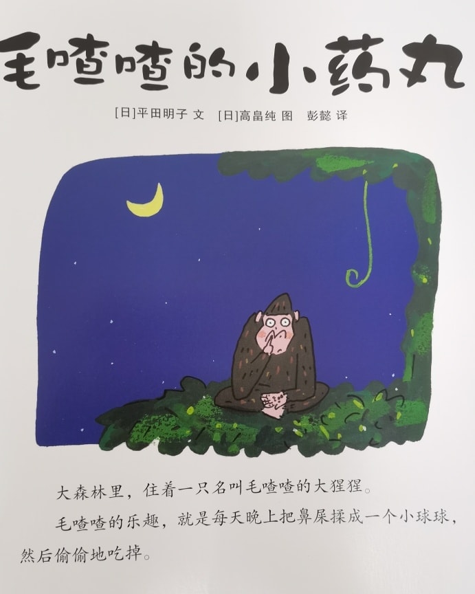 从题目和封面来看,大家能猜到这个故事是讲什么的吗?毛喳喳的小药丸会是什么东西呢?对了!就是那大猩猩———毛喳喳的鼻屎。毛喳喳的手中和地上都是鼻屎,他挖了这么多鼻屎,到底要来做什么呀?