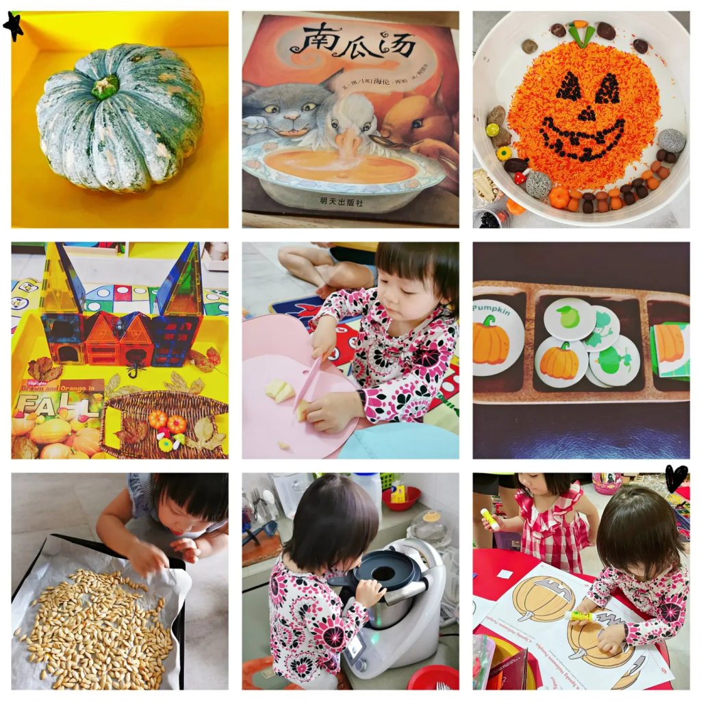 我和homeschool妈妈们找了和节日相关的绘本,延伸童谣儿歌,感官游戏和美术活动。像极了故事里的南瓜汤成员,团结力量大。