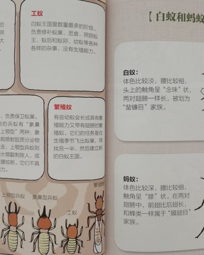 昨天,家里看到这两只蚁,如果是平时,我眼尾都不会去看一下。但,因为刚跟孩子共读了这本科普漫画书,让妈妈我在看到飞蚁时,会带着好奇心去多加留意。这两只蚁,你们知道哪一只是白蚁,哪一只是蚂蚁吗?答案请看下面附上的图画。
