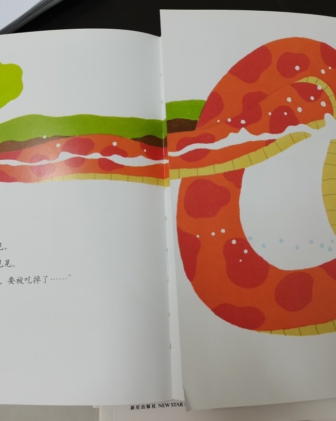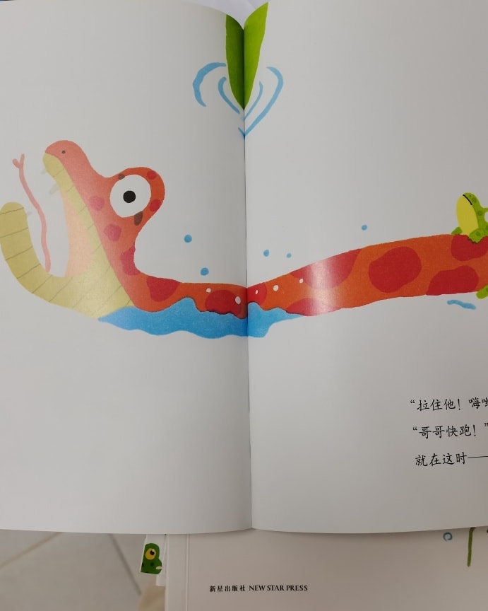书里除了有青蛙兄弟的一家,还有一个很重要的角色——蛇。孩子们会对这条蛇又爱又恨。它的出现,孩子们除了觉得紧张刺激以外,也给他们带来了许多欢笑。