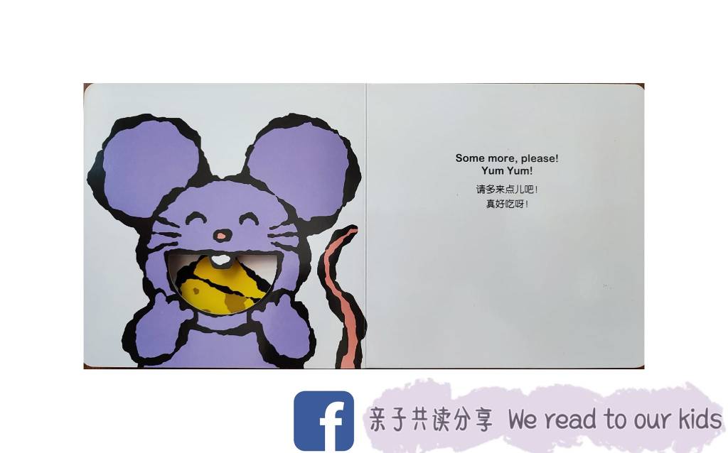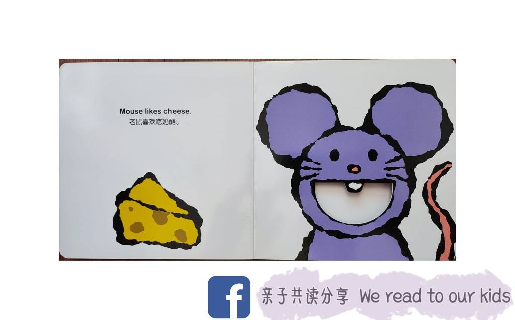 绘本里的挖洞设计也很有巧思。举例附图(一):左边是奶酪,右边是看见奶酪咧嘴大笑的小老鼠。接着翻开下一页,也就是附图(二),这时小老鼠移去左边把美味的奶酪放入嘴里准备吃下去了,并且大呼“真好吃呀!”。