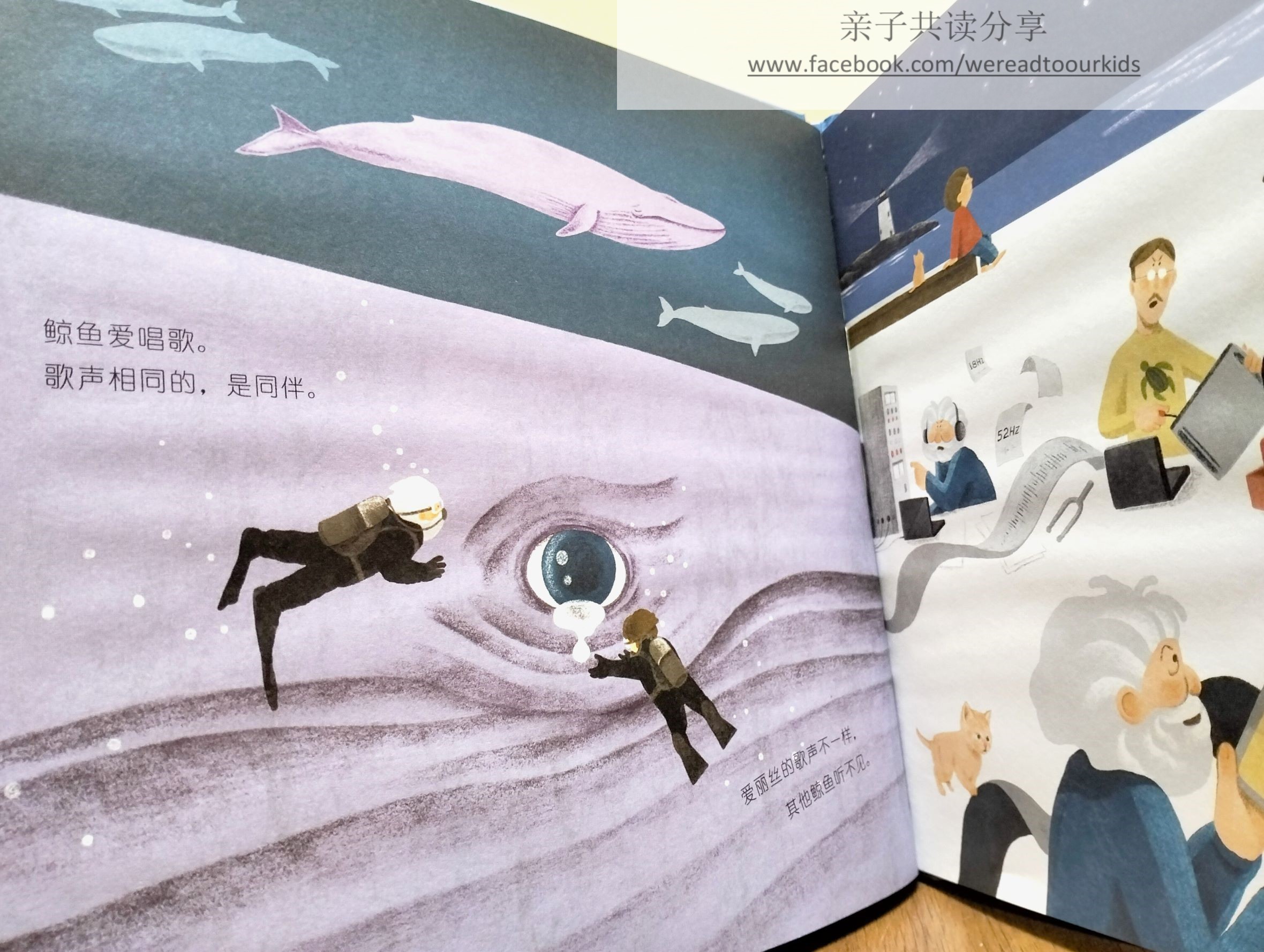 1989年伍兹霍尔海洋研究团队,在北太平洋探测到频率为52赫兹的鲸鱼叫声。而一般监测到的鲸类叫声只有20赫兹左右。爱丽丝的故事经过国际媒体报道后,引起不少关注。虽然海洋研究团队进行了长达十二年的追踪,却始终没见过这头鲸鱼的真面目,也没法确认它真正的物种,可能是蓝鲸也可能是蓝鲸的混合种。唯一确定的是,人们将人类的心灵状态投射在这头神秘的鲸鱼,怜悯之心油然升起,希望爱丽丝终究会找到它的同伴。
