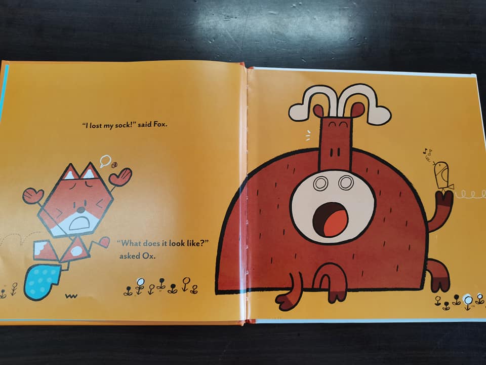 这本书的画风非常可爱,故事简单,而且很幽默。故事的主角,狐狸和公牛都非常讨喜。狐狸那六角形的脸、三角形的耳朵和身体、菱形的尾巴,是不是非常有童趣?我觉得很适合跟2、3岁左右的孩子共读。