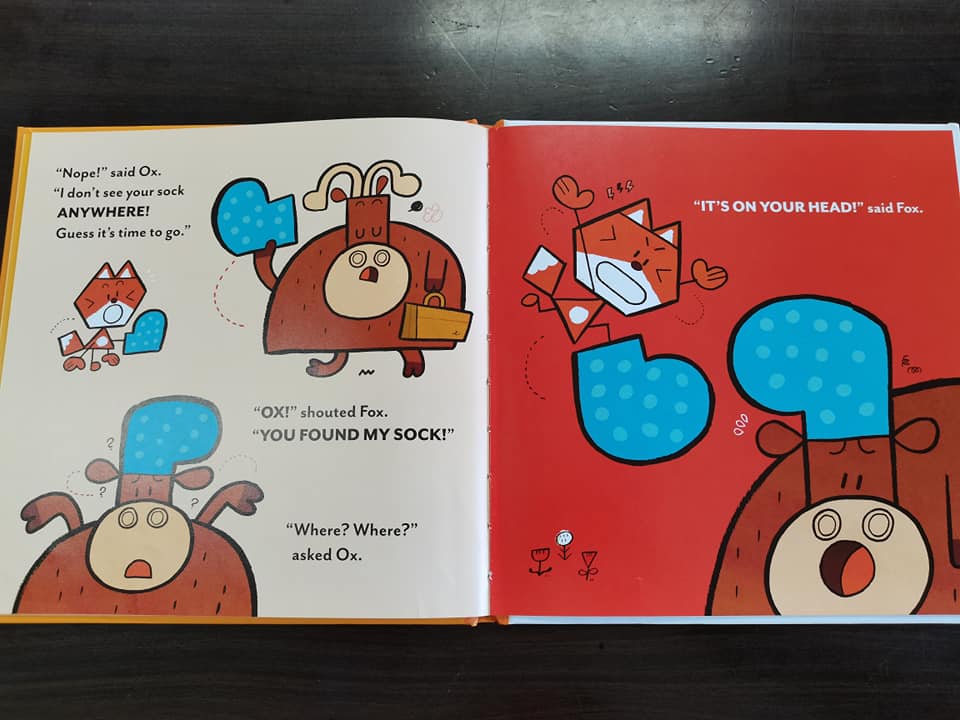 最后,狐狸把另外一只袜子也给了公牛,自己找了另外两只不对称的袜子来穿。故事的结尾是,狐狸问:“有谁看到我的另外一只鞋子吗?”