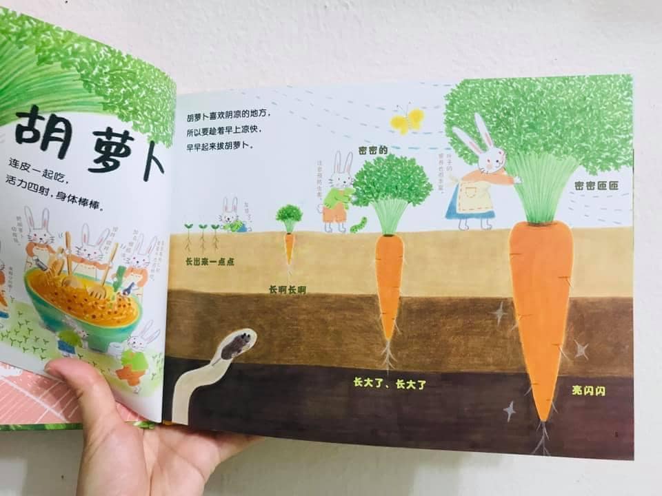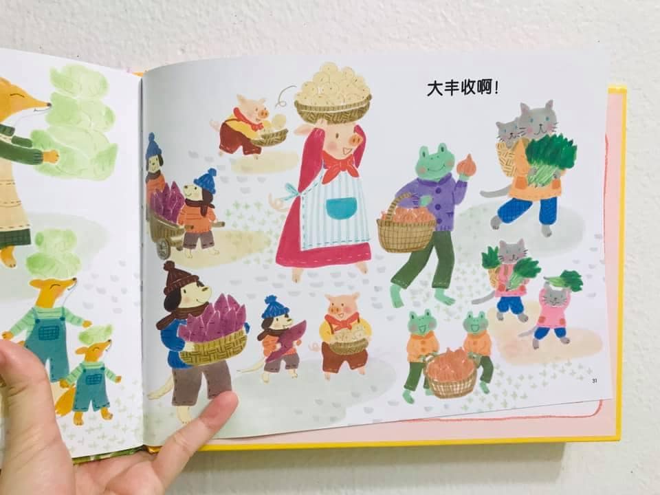 每本书最后都是丰收后小动物们聚集在一起,吃用菜园里采摘的蔬菜做成的美味大餐的画面。特别吸引吃货小朋友们。也许不爱吃菜的小朋友们看了这本书会变得爱吃菜?