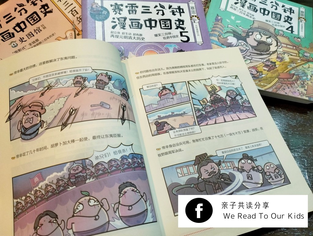 “《赛蕾三分钟漫画历史》跟之前很有名的《半小时漫画中国史》的着重点虽然不太一样,但是皆以现代诙谐搞笑手法讲中国历史,图画精美人物形象呆萌(个个像不倒翁)。原本以为让孩子通过漫画来接触中国历史会比较有趣,结果。。。哈哈大笑的是妈妈,摸不着头脑满脸疑惑的是儿子。虽然他没有抗拒,但明显听不懂。”