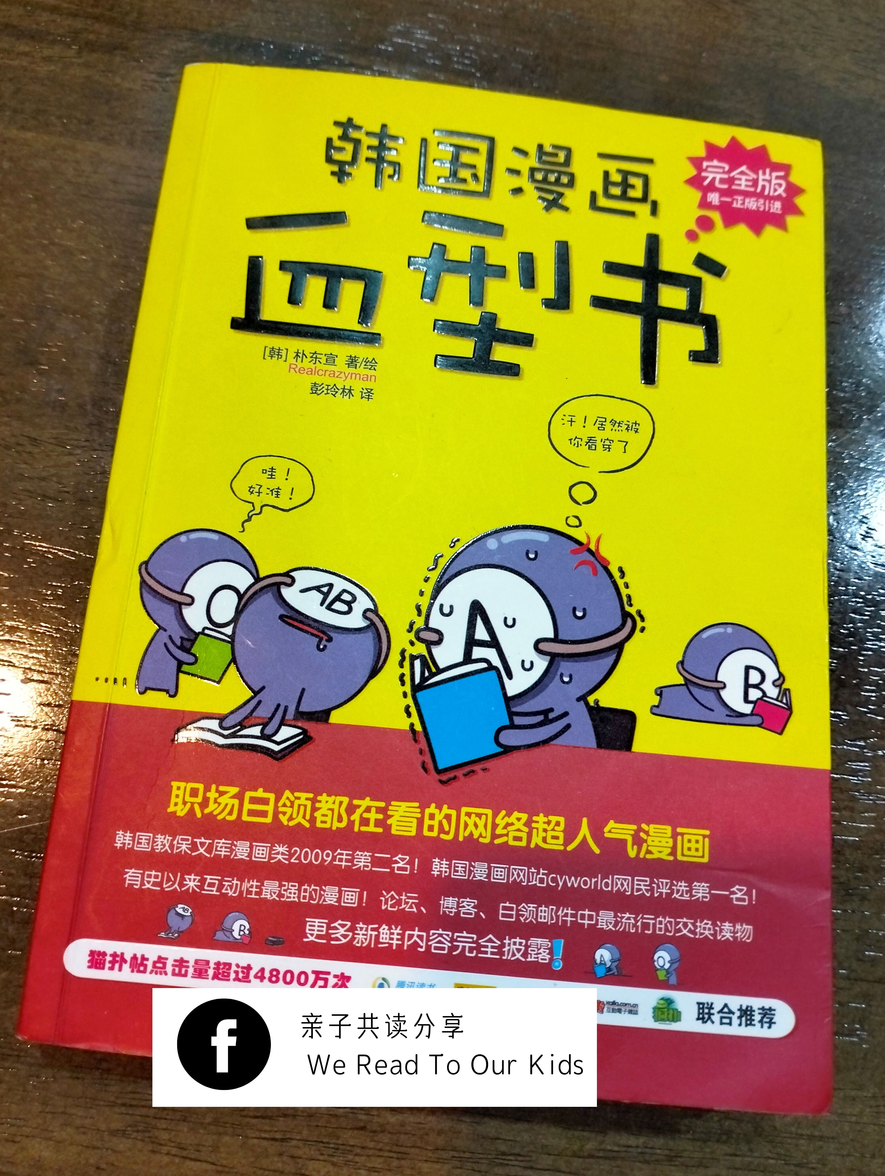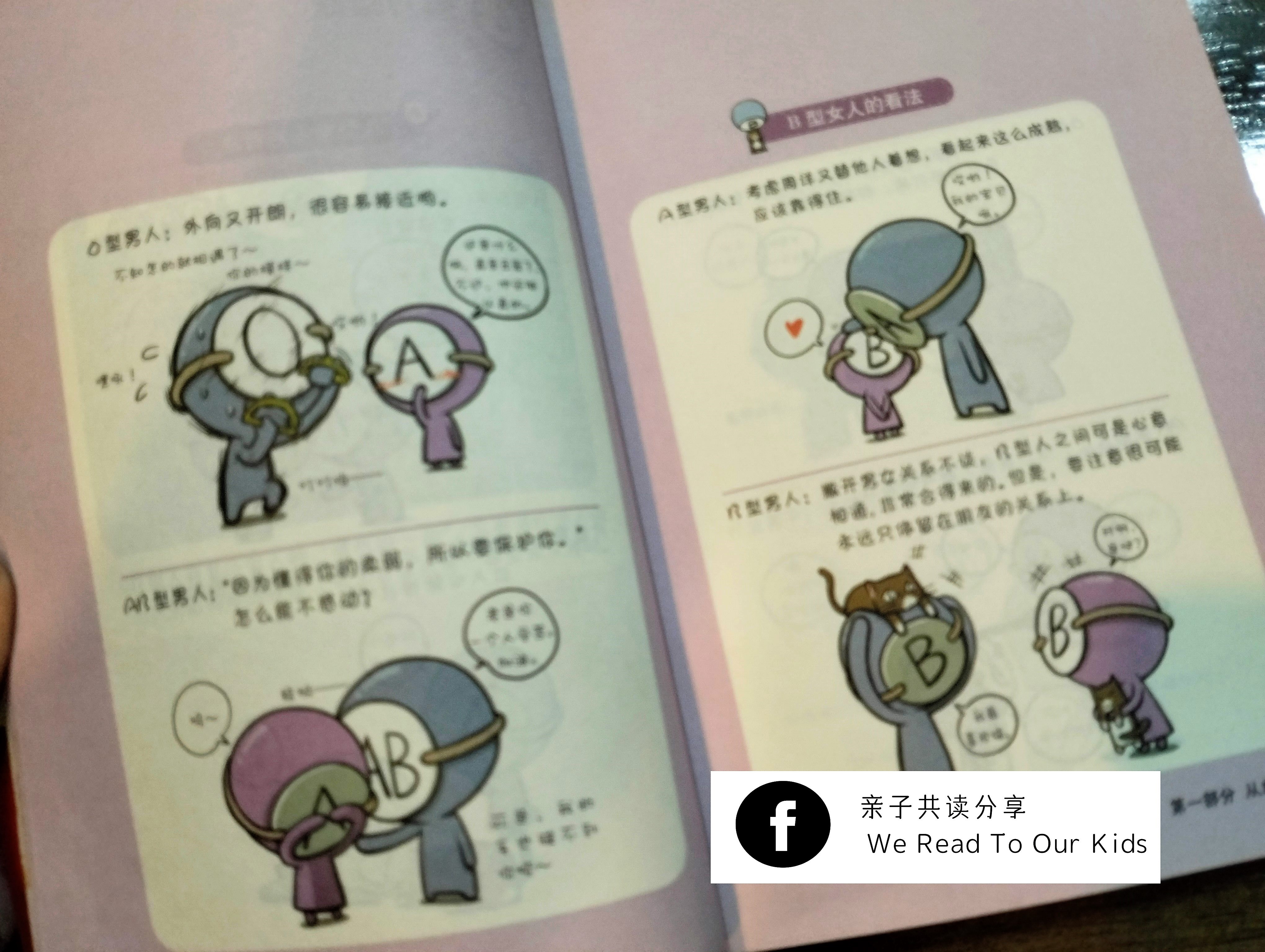 这是若干年前爆红,我一时兴起买来看的韩国漫画。一次打算清书柜的时候,不巧被当时六岁的多多看见,立刻被那圆头圆脑,脸上有英文字母的小人吸引去,连续几个星期每天都要翻一下。最近这本又再次被翻阅,他说图画很有趣,虽然大部分文字看不懂,但丝毫不影响他对这本书的兴趣。这类书纯粹娱乐,别单单用血型看人,以偏概全就好。