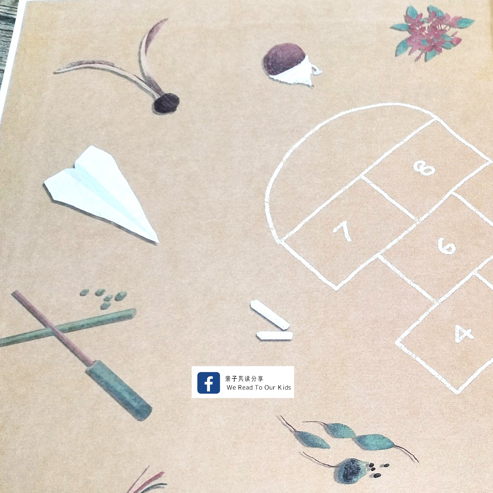 单单蝴蝶页就用了很长时间共读。我必须努力从记忆库里挖掘,几十年前在哪儿玩、跟谁玩,怎么玩。因为是游戏,孩子听得入神也积极回应。原本在一旁滑手机的多爸后来也加入对话,填补我零星碎片化的童年记忆,比手画脚示范男生当年怎么玩跳绳(只能比手画脚,跳不不起来了。),还煞有介事地问孩子,知道为什么风筝线上要抹玻璃粉吗?