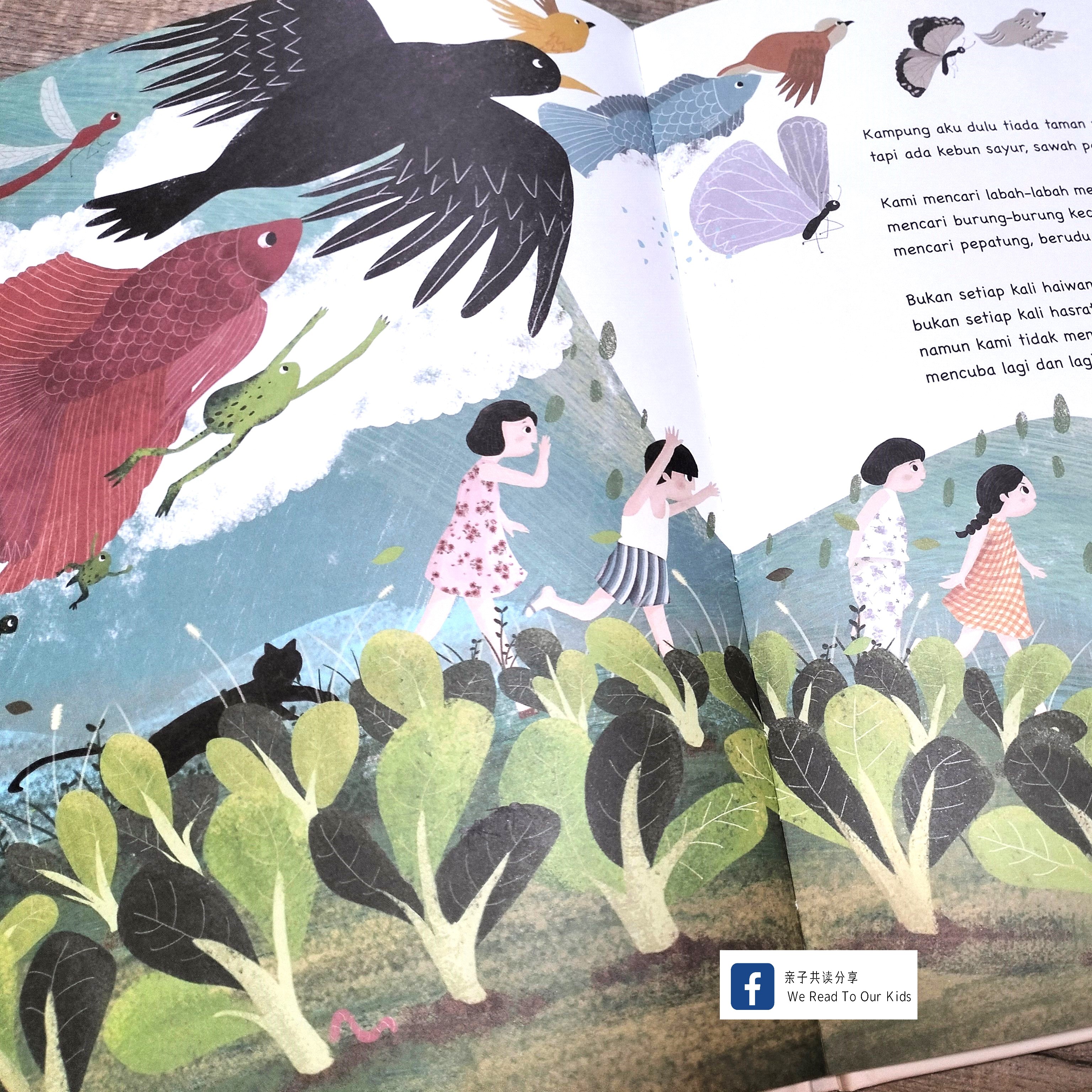 翻开绘本的蝴蝶页,我一边指着里头展示各种不同的游戏,一边尝试解释给孩子听:有congkak、五粒子、毽子、塑胶圈串成的跳绳、陀螺、纸飞机、纸船、玻璃弹球、风筝、橡果、两个我玩过但叫不出名字的游戏,还有一些我不认识的花草果子。