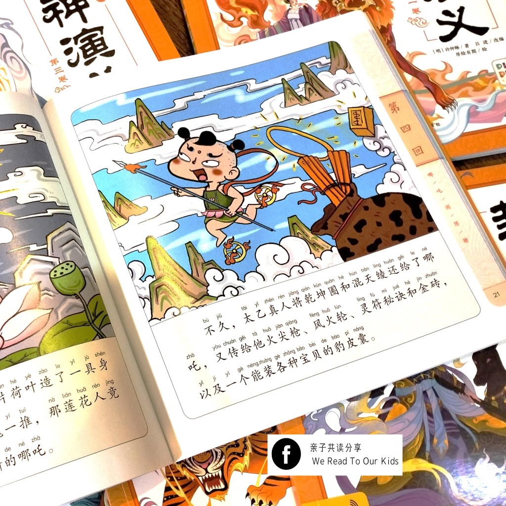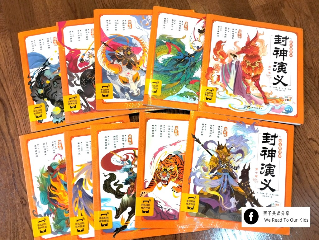 会选择封神榜的故事书,很大原因是自己小时候很爱看中式神话魔法类型的故事。虽然在书本和荧幕上断断续续都有接触过封神演义的故事,但从来没真正读完一套封神榜。一开始共读,孩子就欲罢不能,即便语句偶尔有点生涩也毫不影响他继续听下去的兴致。因为是高度浓缩版,很多情节太快,孩子如果第一次接触这些故事,可能会不明白。家长从旁指引,正好让一天比一天少的共读时光延续下去。