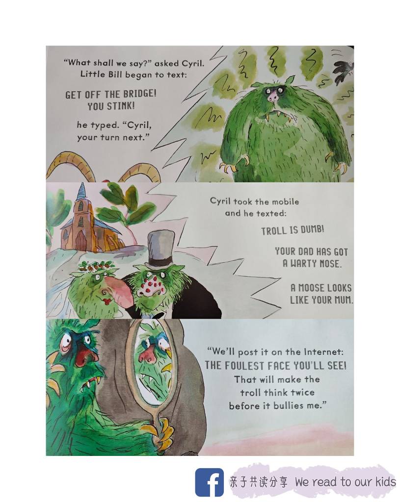 绘本标题Troll stinks是一语双关,可以说是里面的山怪给人家的不好印象,也可以说是键盘侠、网络喷子和酸民。网际网络是很便利的工具,但使用不当就会造成伤害,不一定只是伤害别人,很可能自己也会被伤害。