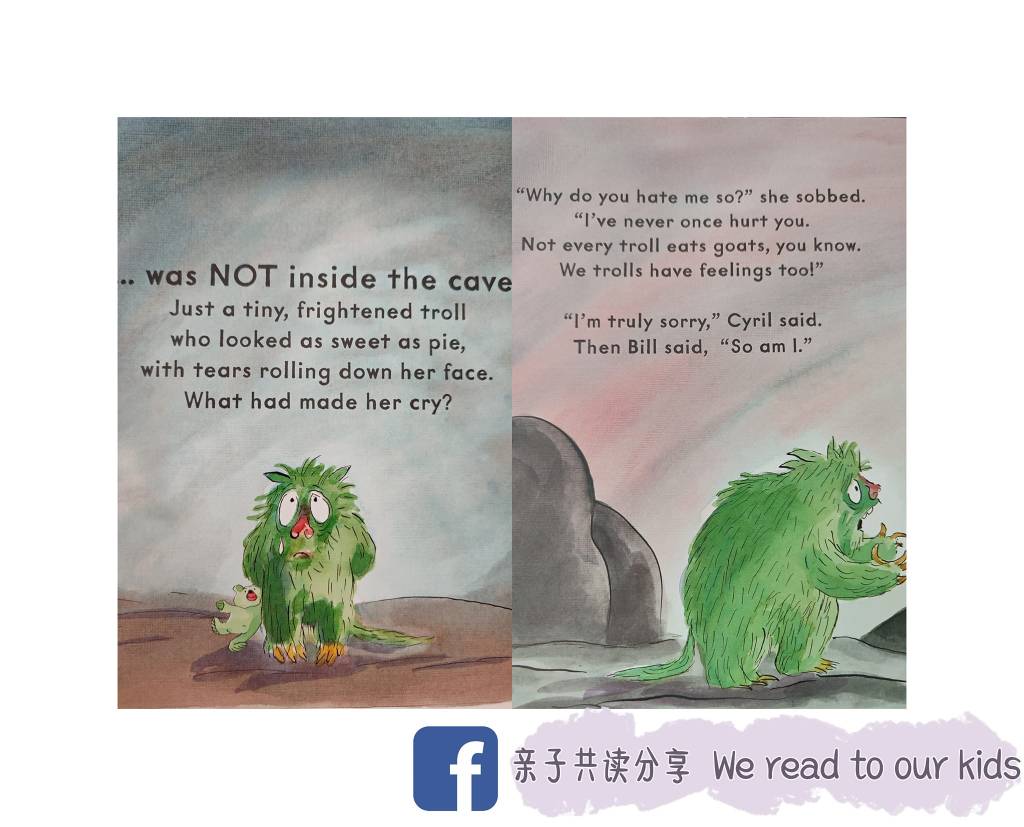 接着他们轮流发了一些恶毒并具有人身攻击的信息给山怪。他们甚至还想到要去拍下山怪的脸然后放上网络公开。他们认为这样山怪就不敢再欺负山羊了。最后他们来到了山怪居住的洞穴。他们见不着可怕又坏的山怪,只见山洞里只有一只小小的、瑟瑟发抖、眼泪直流的山怪。