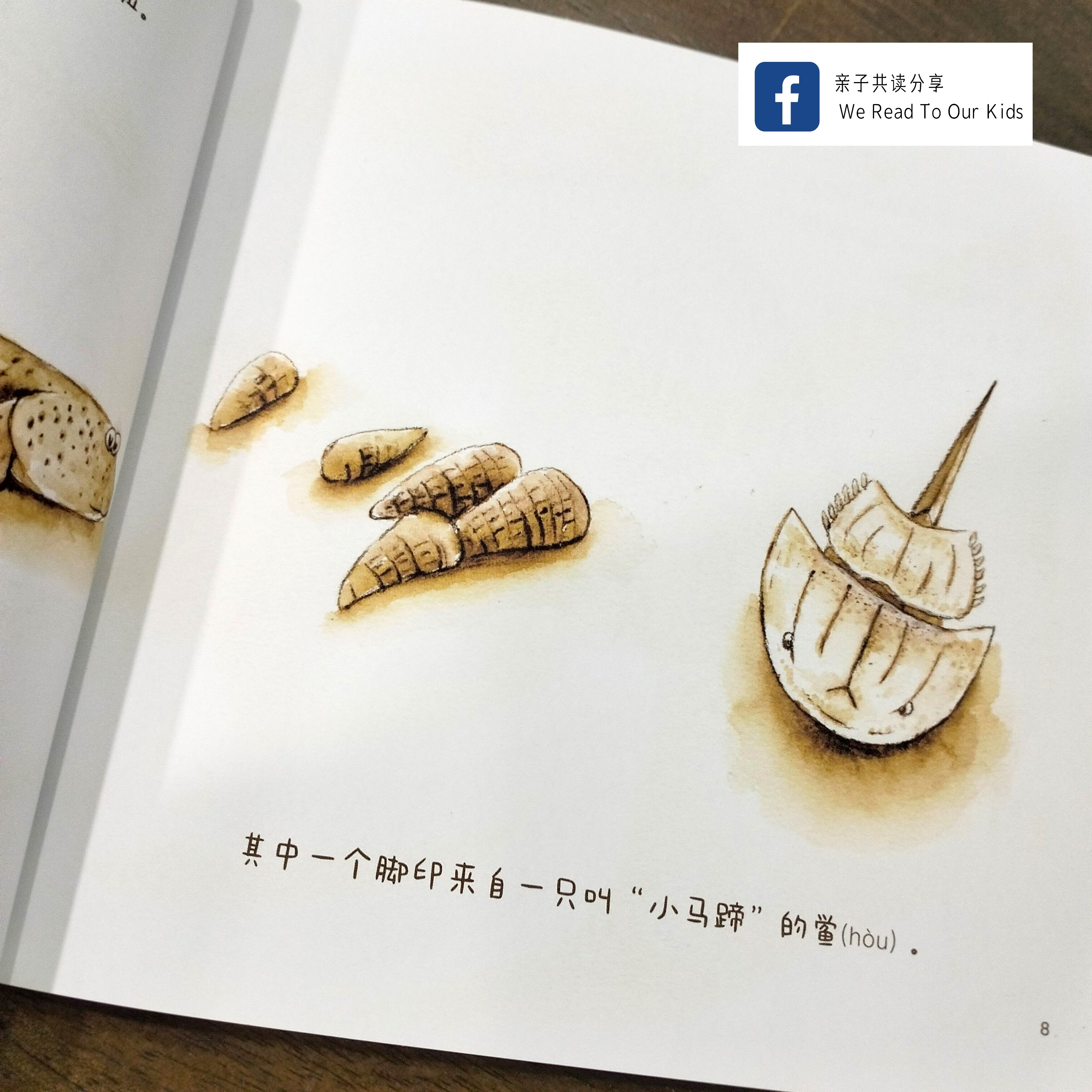 书的故事主轴都以咖啡渣液作画,视觉上已经让人眼前一亮。故事讲述一只名叫“小马蹄”的鲎的成长故事,带出鲎的成长过程与各种人为因素对它们所造成的伤害。图画与文字的搭配,比起其他本地自然生态类型书籍,更接近绘本该有的特征。小马蹄的故事结束后,还有较详细的介绍本地鲎的现况以及延伸活动,适合与不同各年龄层的小孩共读或自主阅读。