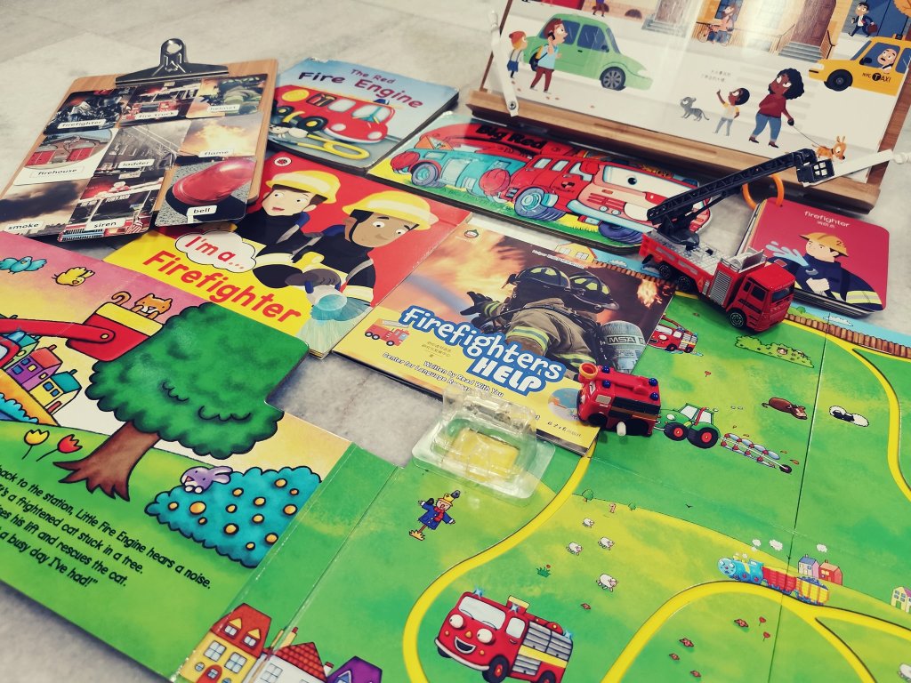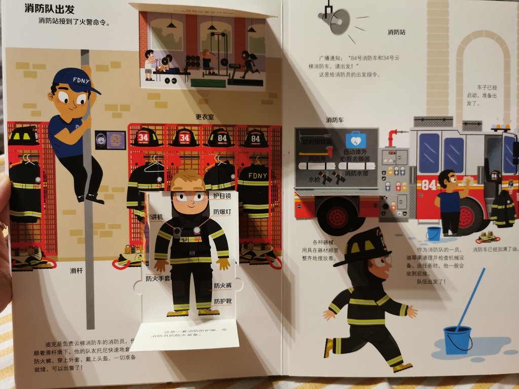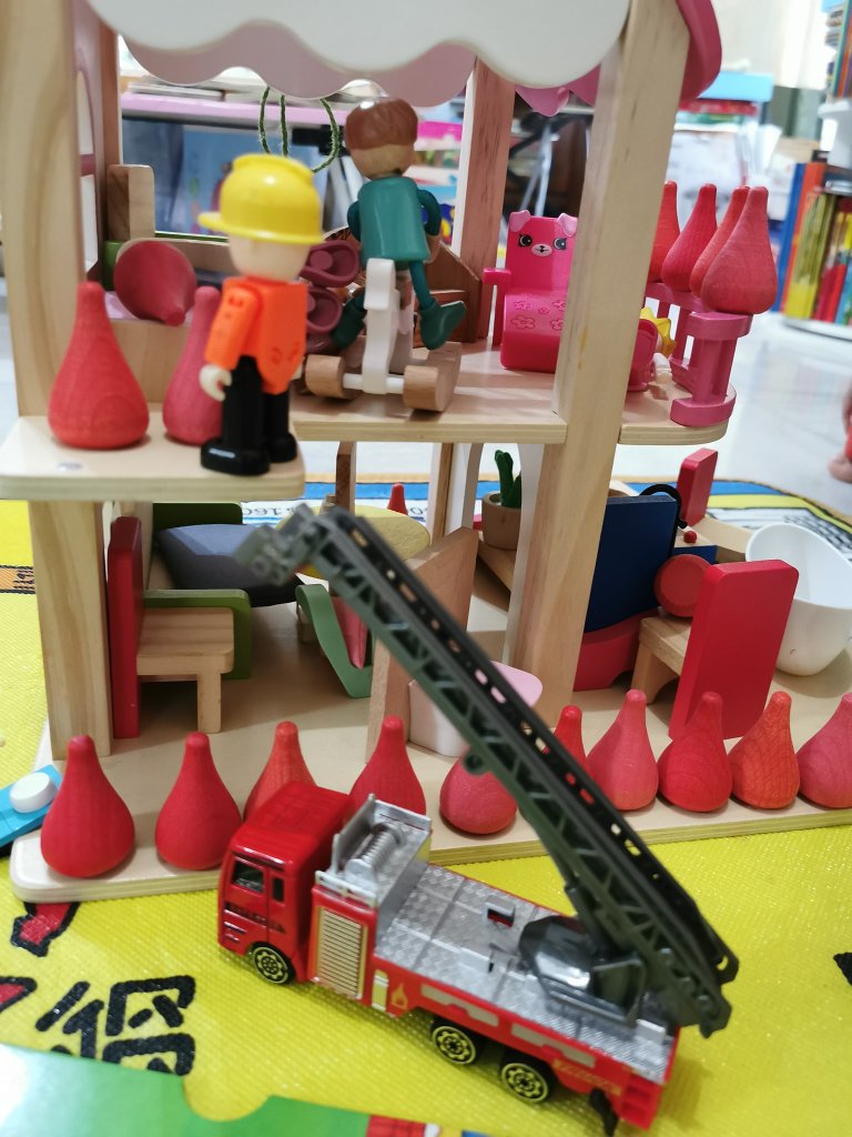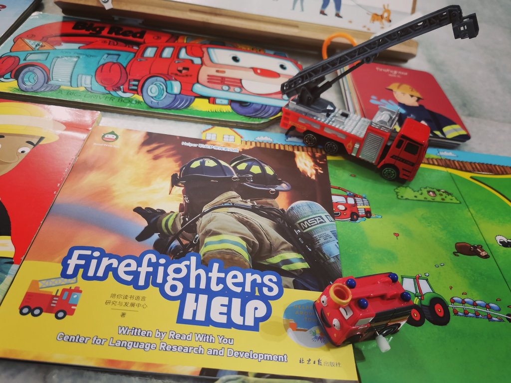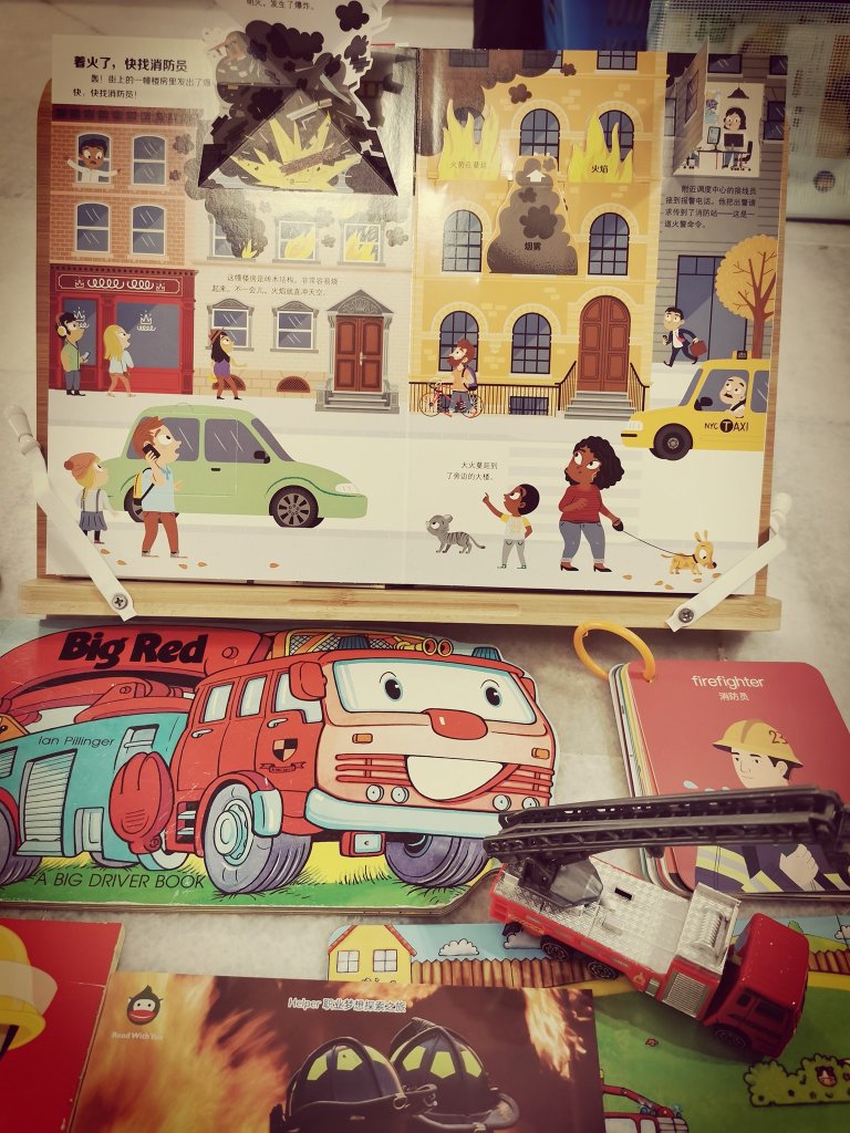 我们还体验了坐消防车环绕一圈,爬上消防车顶端,玩水。大人小孩玩的很开心,真是很棒的体验!回家后,娜娜妈开始插播消防主题,找了有关消防主题的绘本科普书和进行消防主题延伸活动: