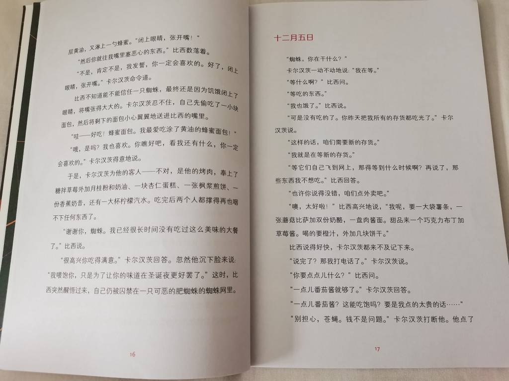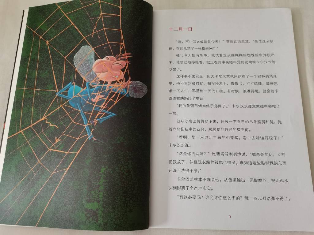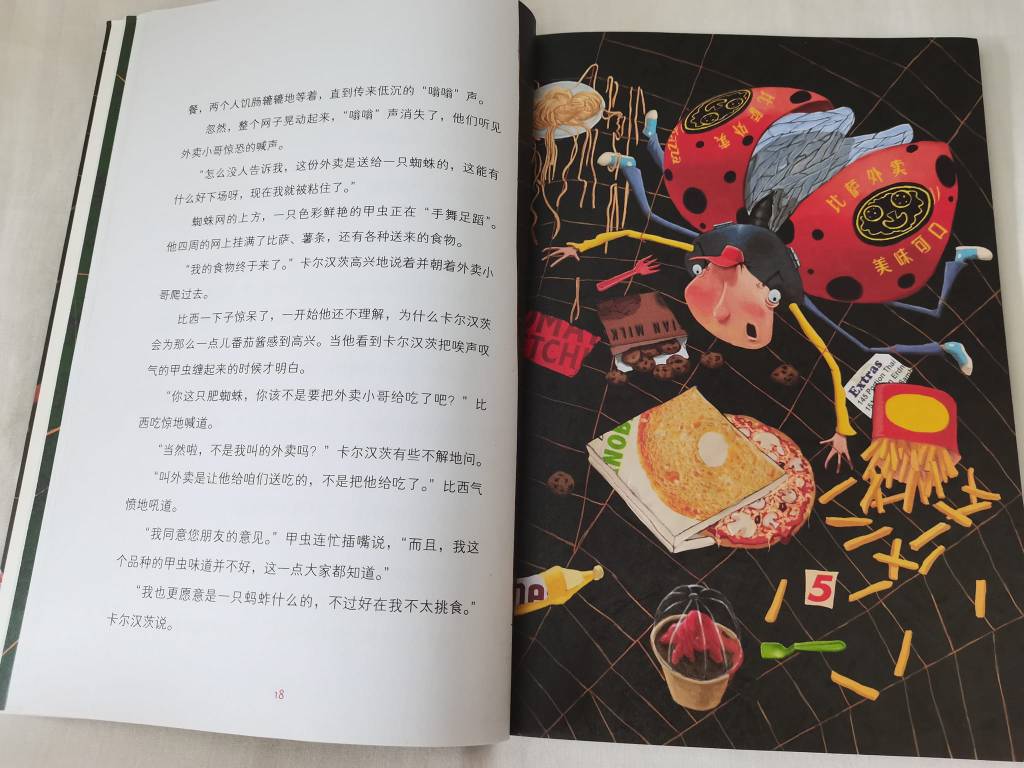 有一次,它俩肚子饿,比西建议上网订外卖。比西点了好多食物,而卡尔汉茨只点了番茄酱。原来卡尔汉茨心里盘算着,那食物就是送餐小哥。后来卡尔汉茨在比西的说服下,把送餐小哥放走了。我们母子仨都为那送餐小哥捏了一把冷汗。难怪没有昆虫喜欢和蜘蛛来往,连医生、牙医都害怕给它们治疗。