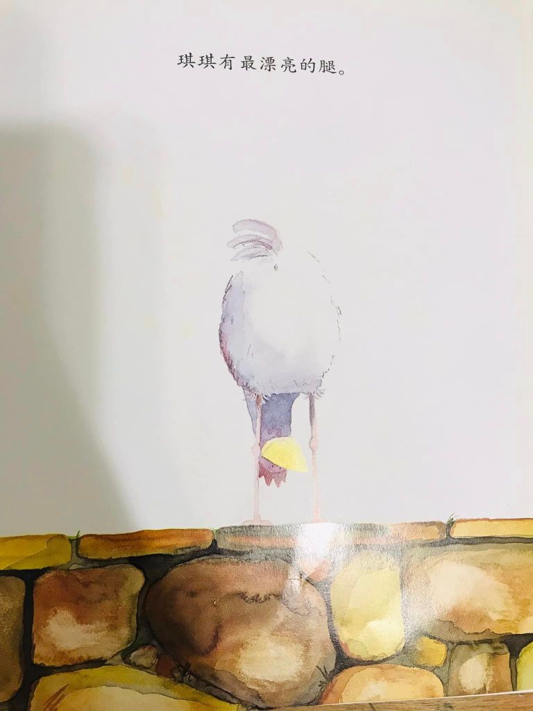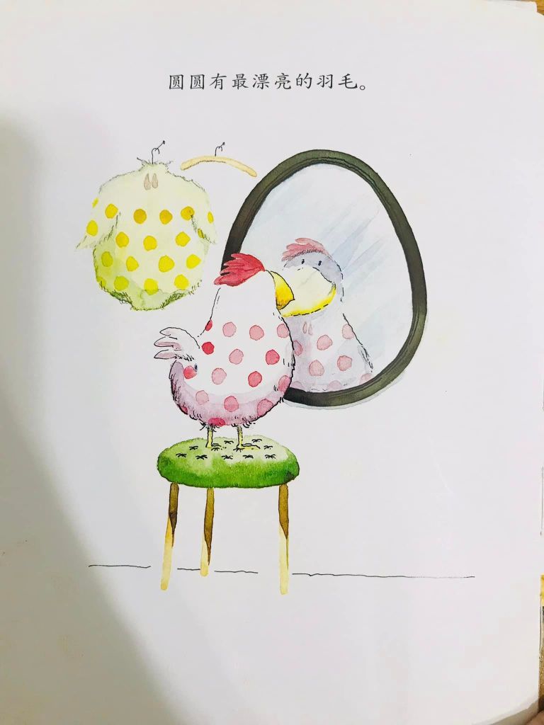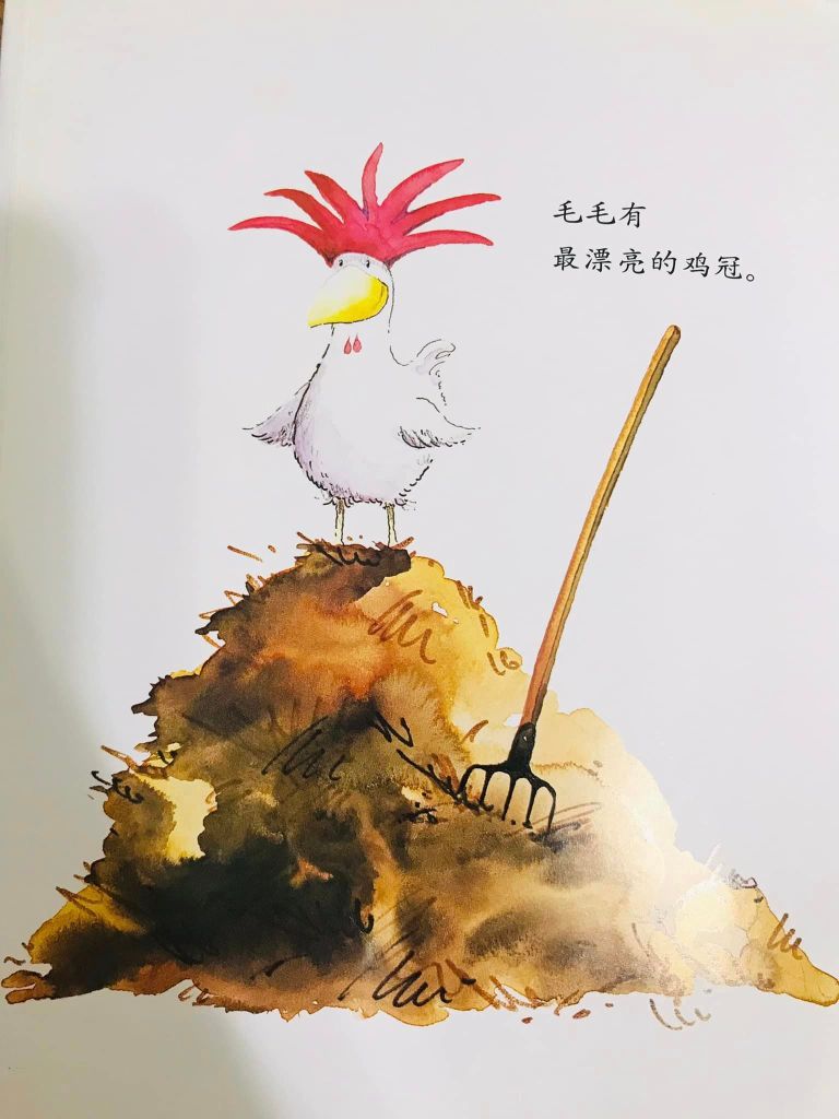 故事一开始,作者就在悄悄地暗示这样的意思了:三只母鸡,都说自己漂亮,圆圆炫耀的是自己的羽毛, 琪琪炫耀的是自己的腿,毛毛则炫耀她的鸡冠。她们都有自己的所长,谁也不落入别人后面。