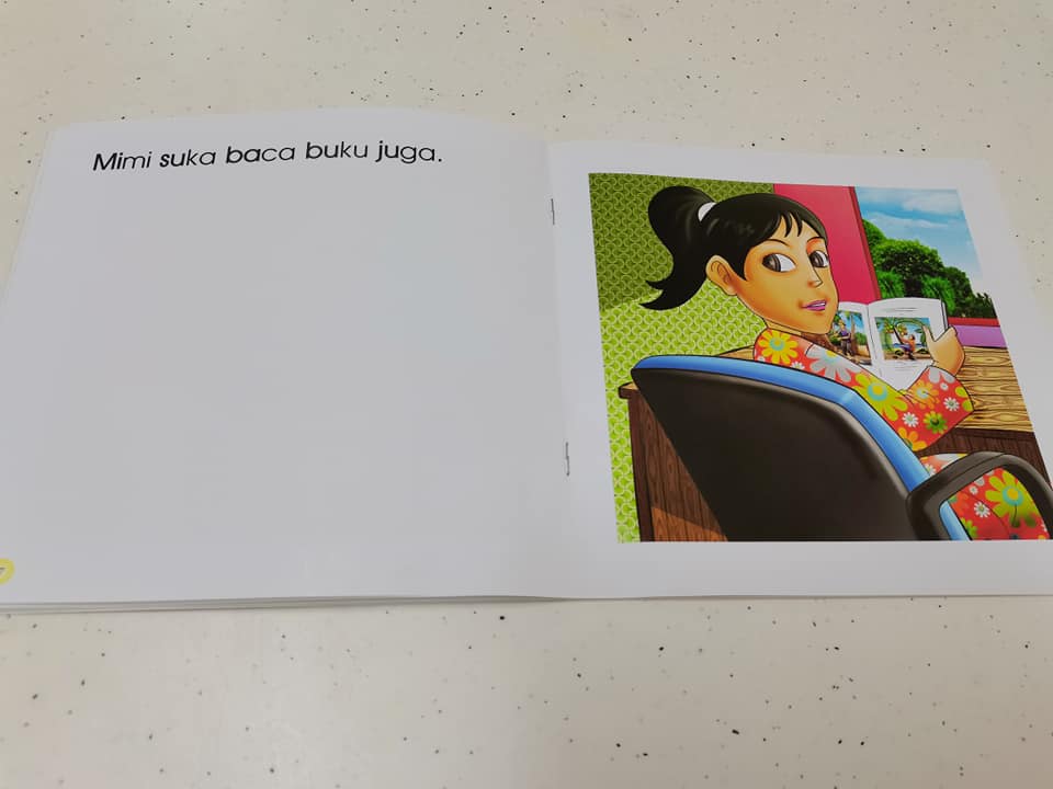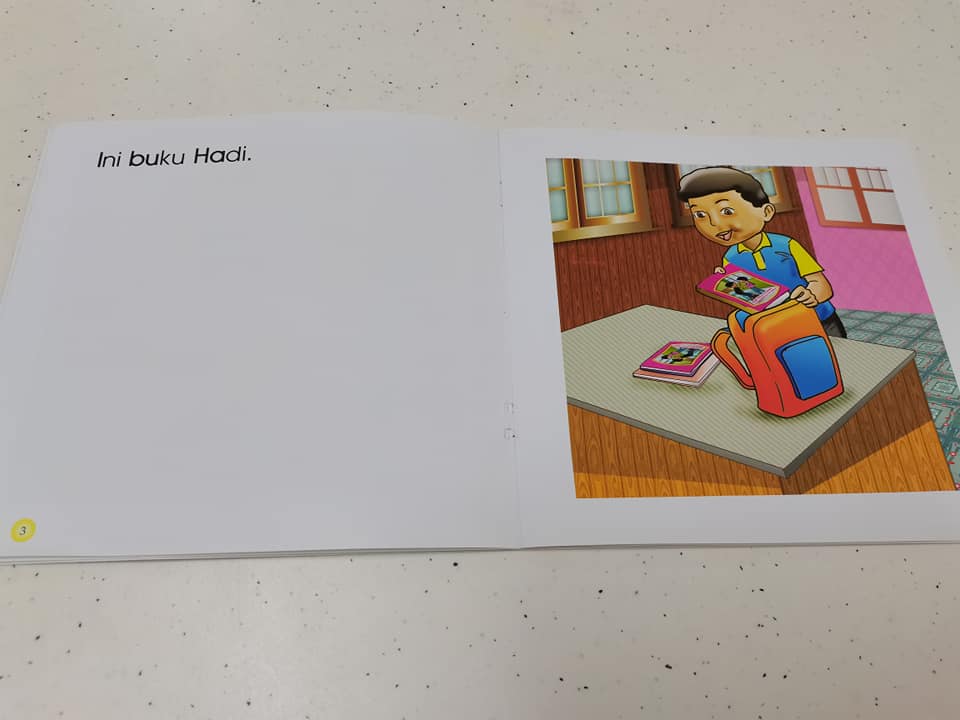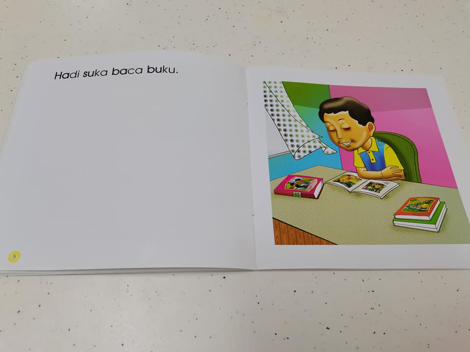 这套初级的书,是适合幼儿园的孩子,刚好可以给我家读小一的哥哥。内页的字用了灰色和黑色来分开suku kata,让孩子很容易就读出正确的发音。