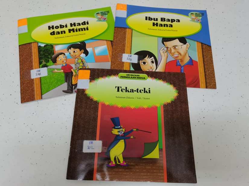 学习一个语言,不外是听说读写嘛。在没有用国语沟通的环境下,听和说肯定是做不到的(不要问我为什么做不到),那就多阅读吧!还好,我可以去学校图书馆挖宝,不用掏钱包买。我找到了这系列的国文分级读物,Siri Bacaan Permulaan Pertama。