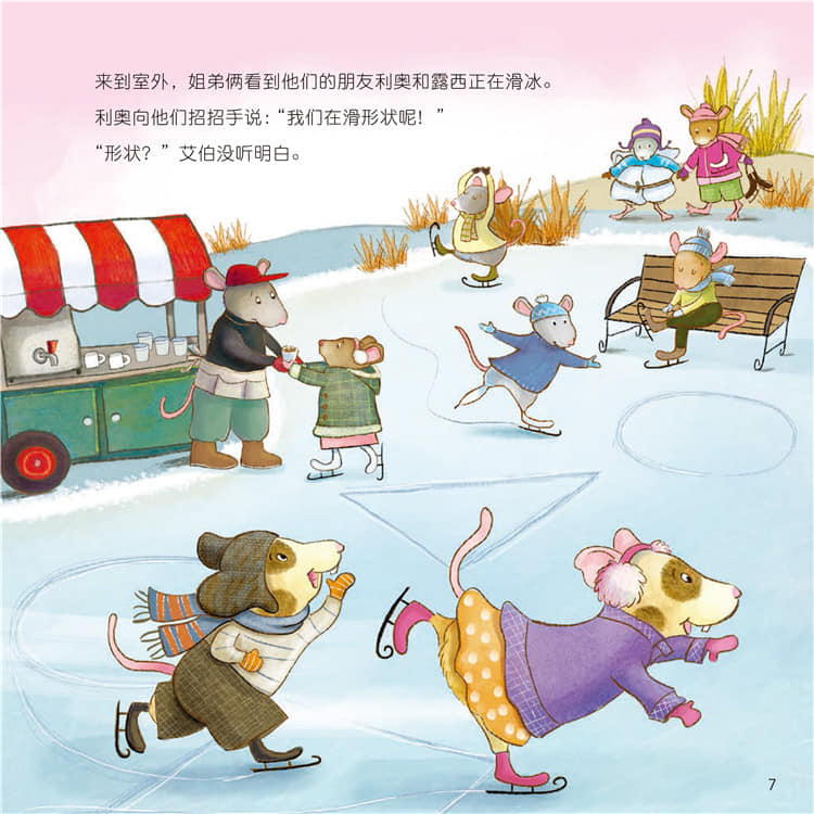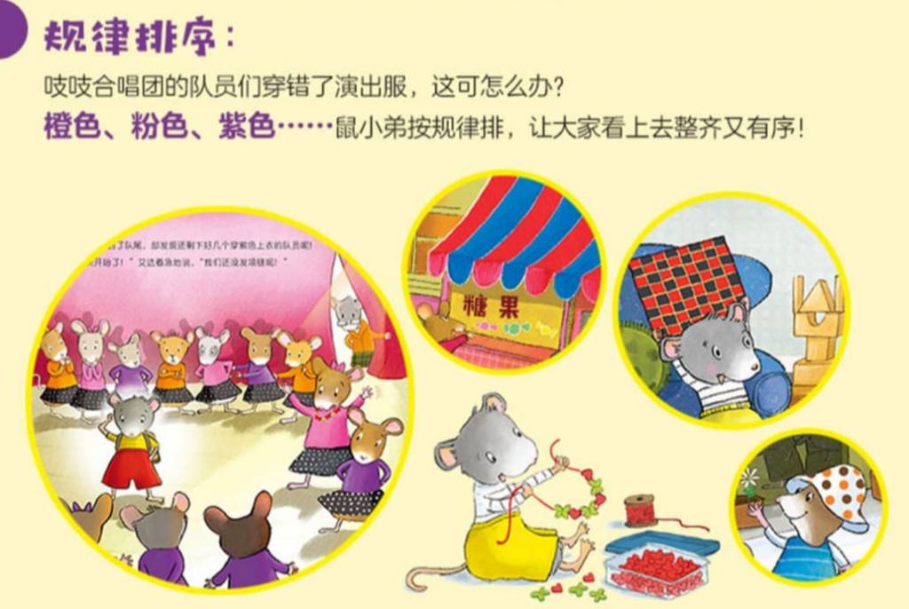 无意中在图书馆挖了这系列中的《吱吱合唱团》,绘本中作者用鼠小弟的视角带出什么是规律排序。也就是我们说的ABAB,ABBA等等的规律。故事的一开始就说起鼠小弟去奶奶家,恰巧奶奶正在给黄色和绿色布块排序,给鼠小弟制作一张被子。鼠小弟帮忙奶奶排列布块,可是却被奶奶纠正,因为奶奶是用ABAB的方式排列。在奶奶耐心的解说下,鼠小弟发现原来有了规律,东西看起来整齐美观多了。离开奶奶家,他也开始注意到原来生活中藏着不少规律排序的物品呢!鼠小弟get了规律排序的技能,还帮助姐姐解决了合唱团面对的大难题。