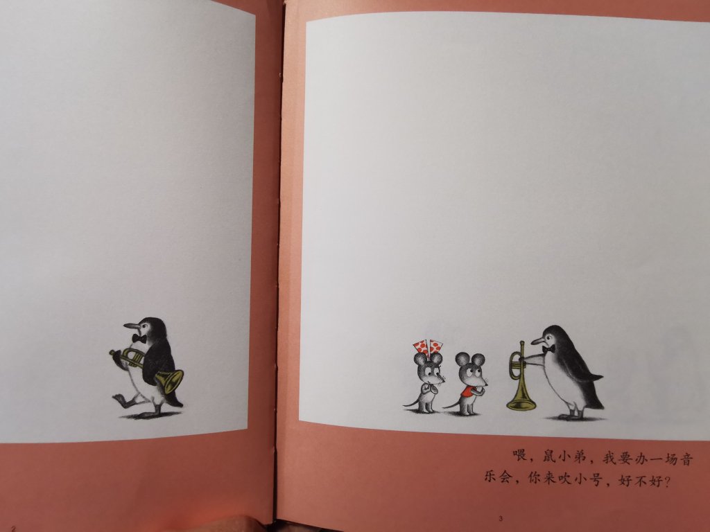 故事讲述企鹅先生要举办音乐会,它给了鼠小弟一个小号,让鼠小弟好好练习。
