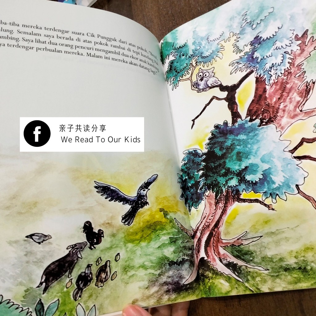 情节着重在动物们讨论策略,利用各自强项一起抓贼。故事很容易理解让低年级生,但由于用字比较深,马来文掌握能力还不够的孩子应该听不懂。以这本作为中、高年级读物,练一练马来文阅读能力也是不错的