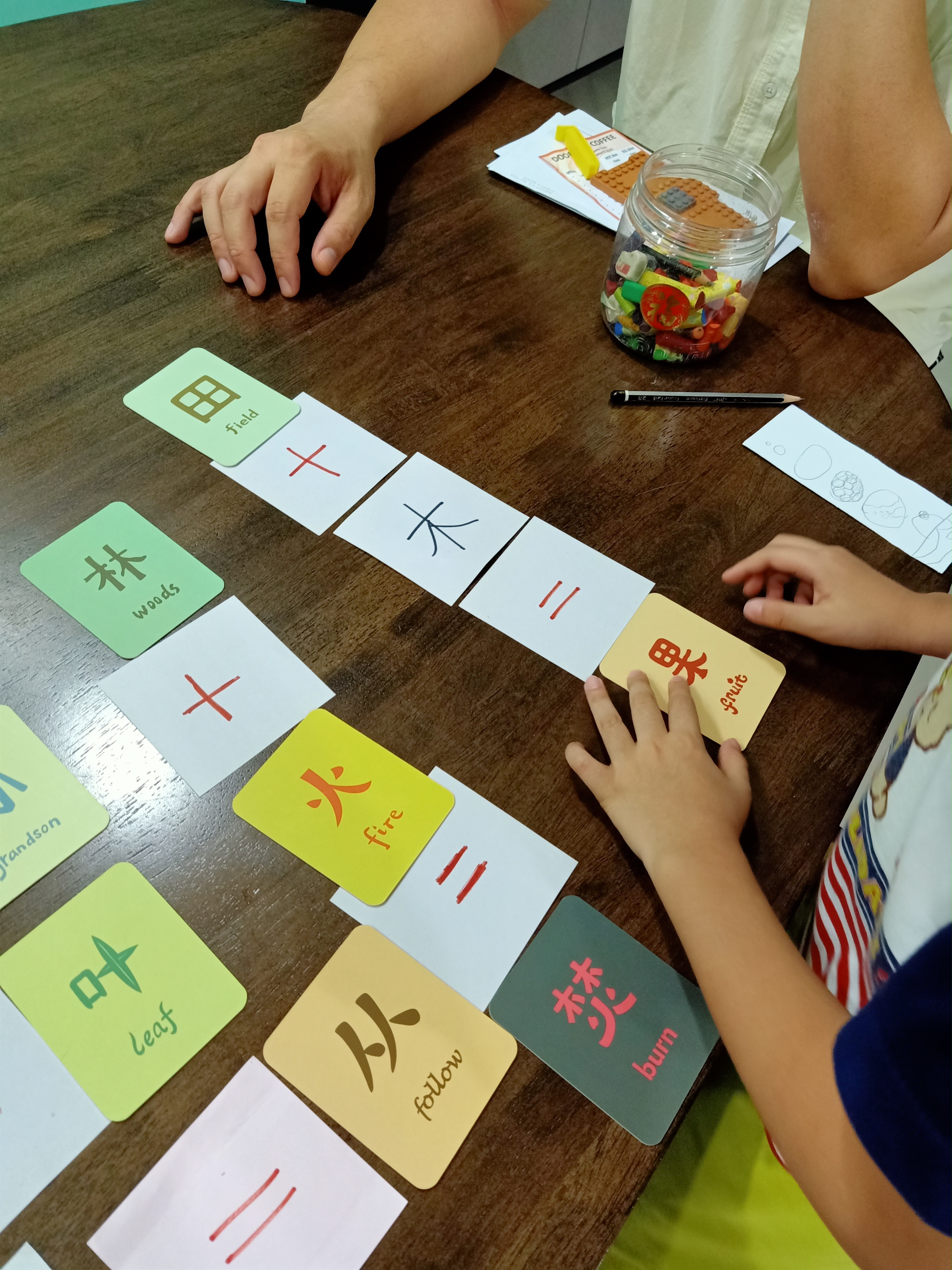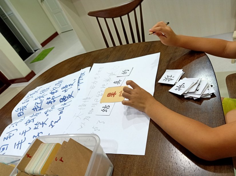 - 缺字卡的字,如果不难,我都让他自己写在小纸张上当字卡用,不然就是我写给他。