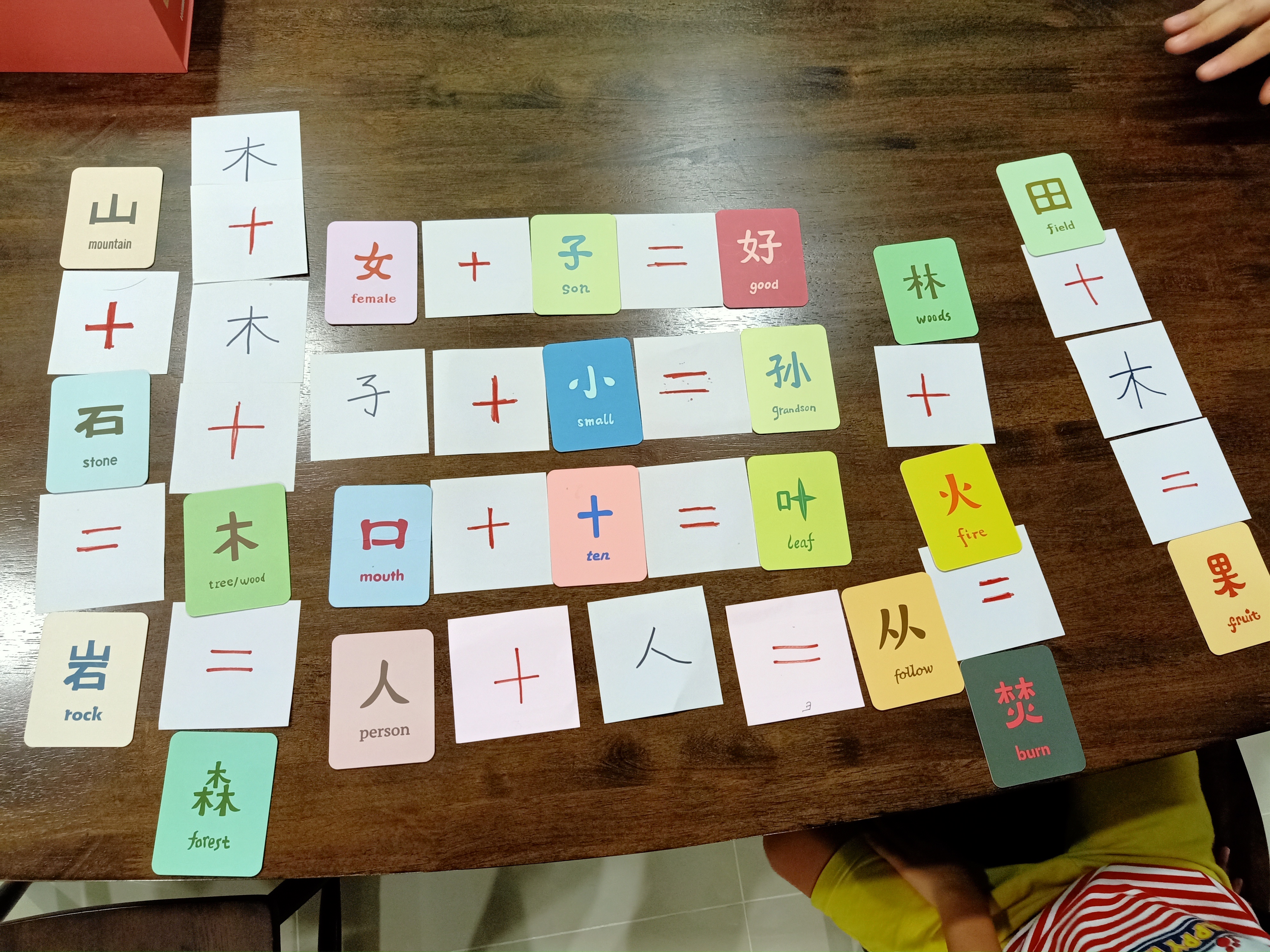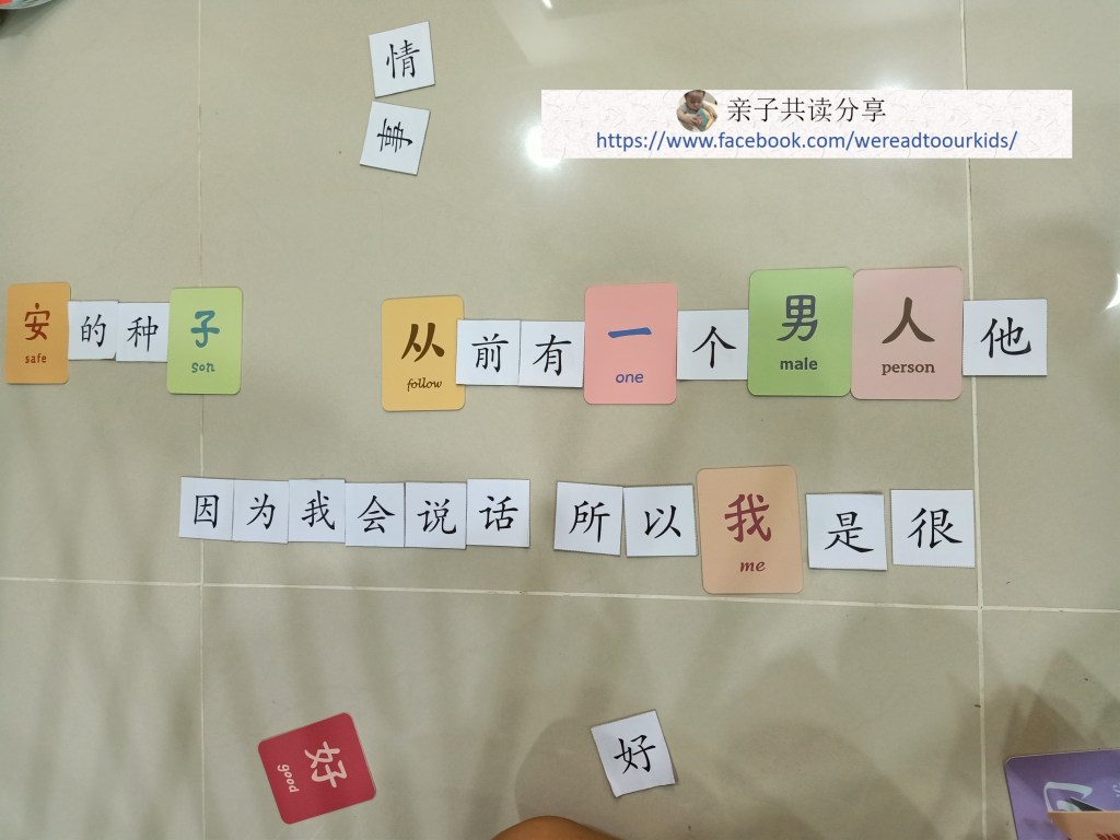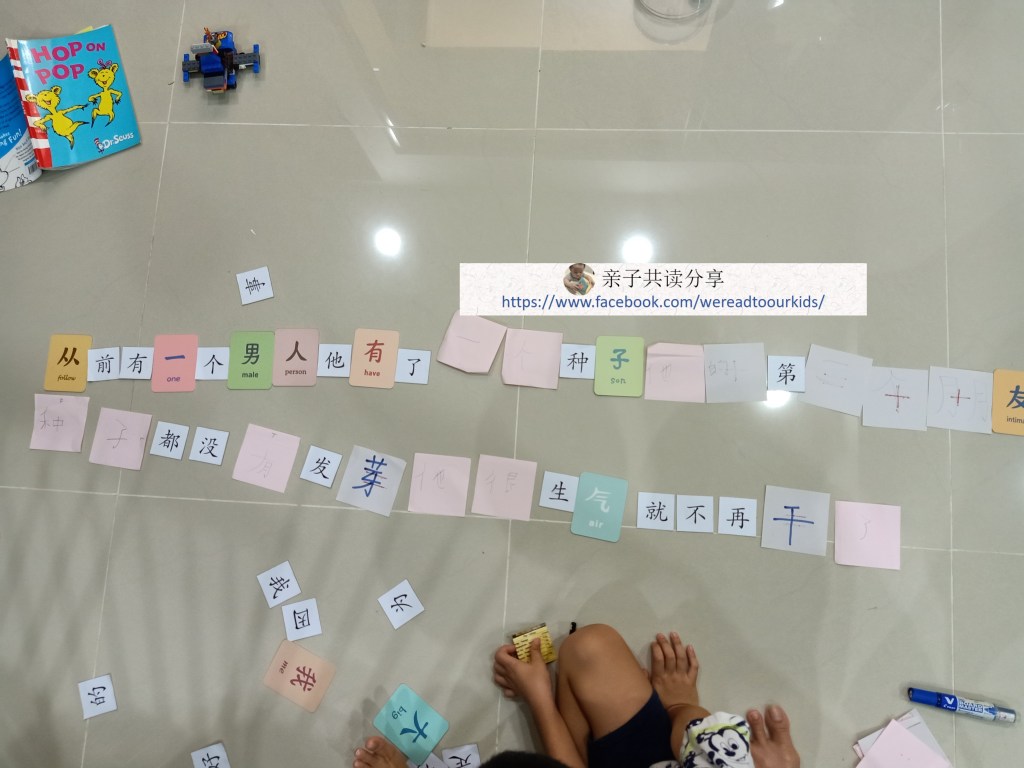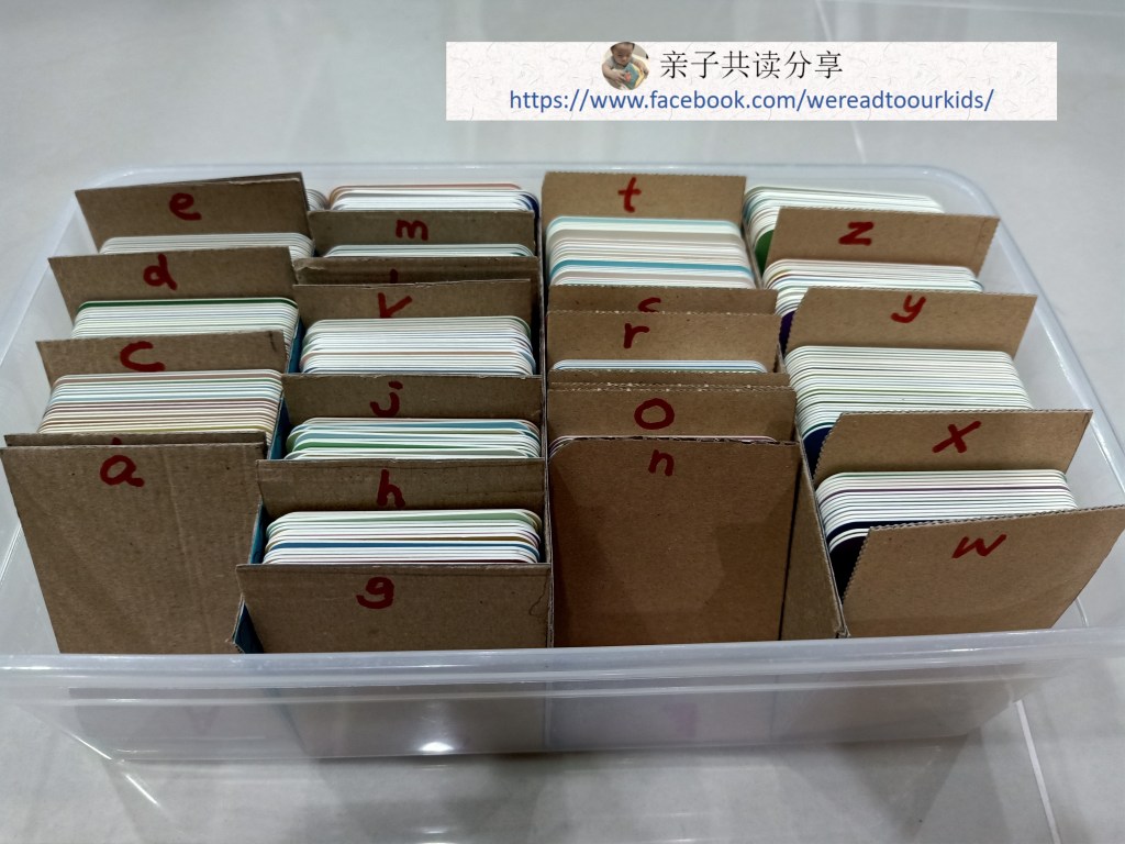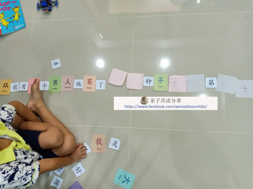 - 整个学习过程,我就充当小秘书。除了字卡收纳箱子我不让他碰以外,他要什么字,我教他辨识声母后,就拿出相关声母的所有字卡,让他自己找他要的字,我再把其余的字卡收回箱子(实在怕他弄乱我会收得很惨)。词汇运用,句子构造,我不干涉,但会让他自己重读自己的句子,看要怎么接。