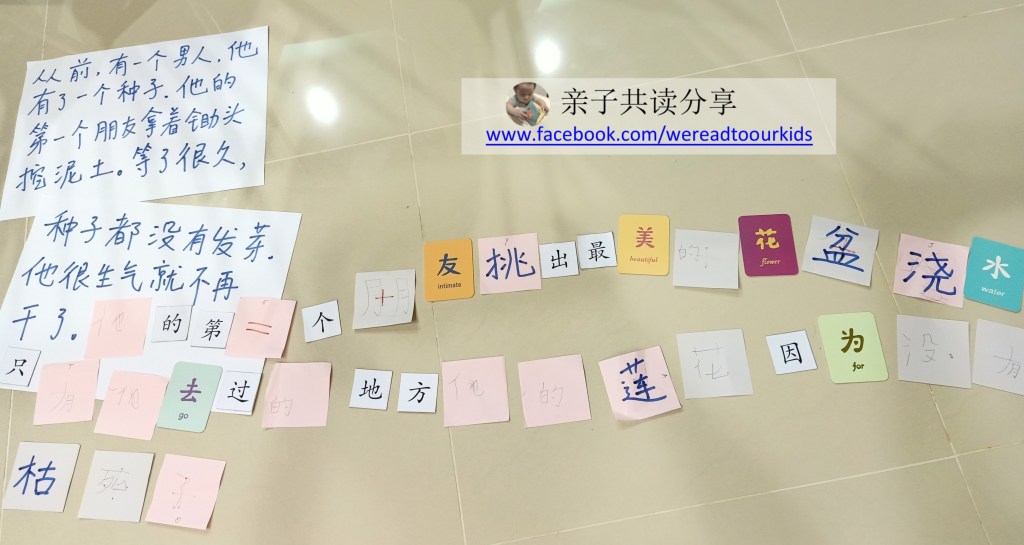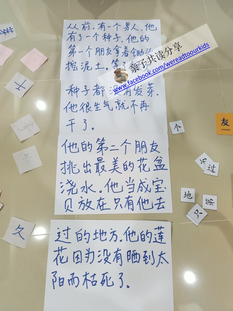 今天早上本来想要试试用字卡随机配词语,由“因为”,“所以”,“事情”开始,结果孩子偶然下配成“安的种子”这四个字后,开始用字卡说着他那又长又臭的故事。。。