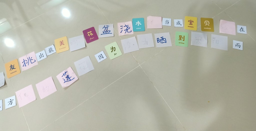 - 注:标点符号还没教,在考虑要不要继续做字卡,让后拼音排序再细分,z, zh, s, sh,考虑中。。。
