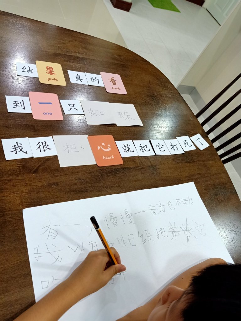 - 每次排完一个句子我都让他念一遍,由于都是自己挑的文字,比较像是复习生字。值得一提的是,像“惊讶”,“化蛹”,“温暖”,“一动也不动”,都是他自己的用字。