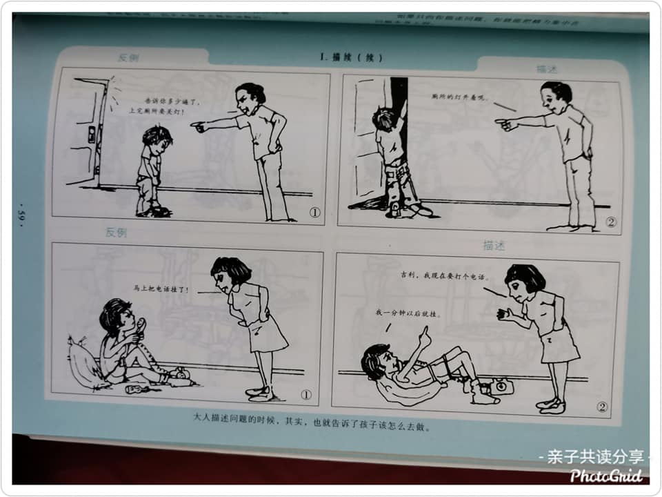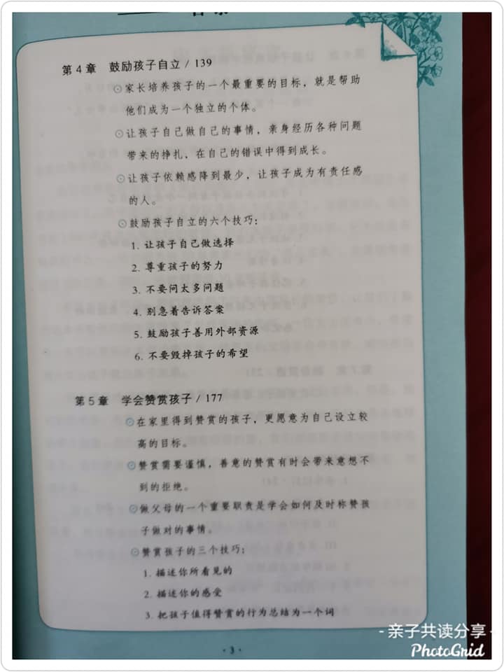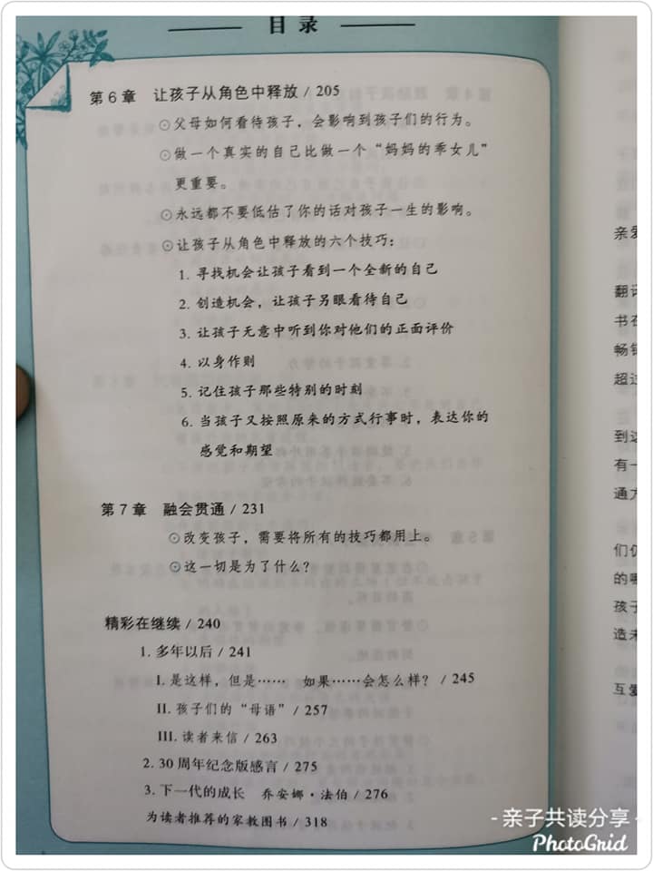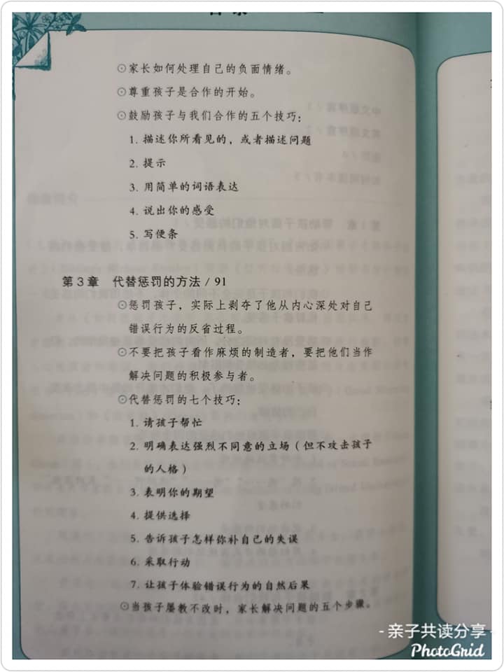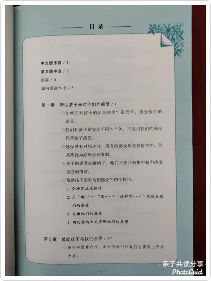 因为……太多诱惑了,一腾出时间来,就是想刷手机、做教材准备、陪孩子玩中学和画画粉彩。有段时间跟亘宝相处的时候,心里一直冒出“我都不知该拿你怎么办了”,这样的一个想法。所以那段时间我阅读速度会比较快速,刚好头两个章节就是说如何有效地跟孩子沟通(详细请附图里的书本目录)。