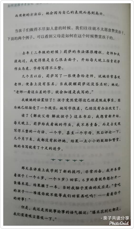 实际例子都是由出席作者举办的小组中的家长所提供,除了举例发生的状况,也有提到使用书籍里的技巧之后,孩子和父母的沟通方式和亲子关系有了什么改善。