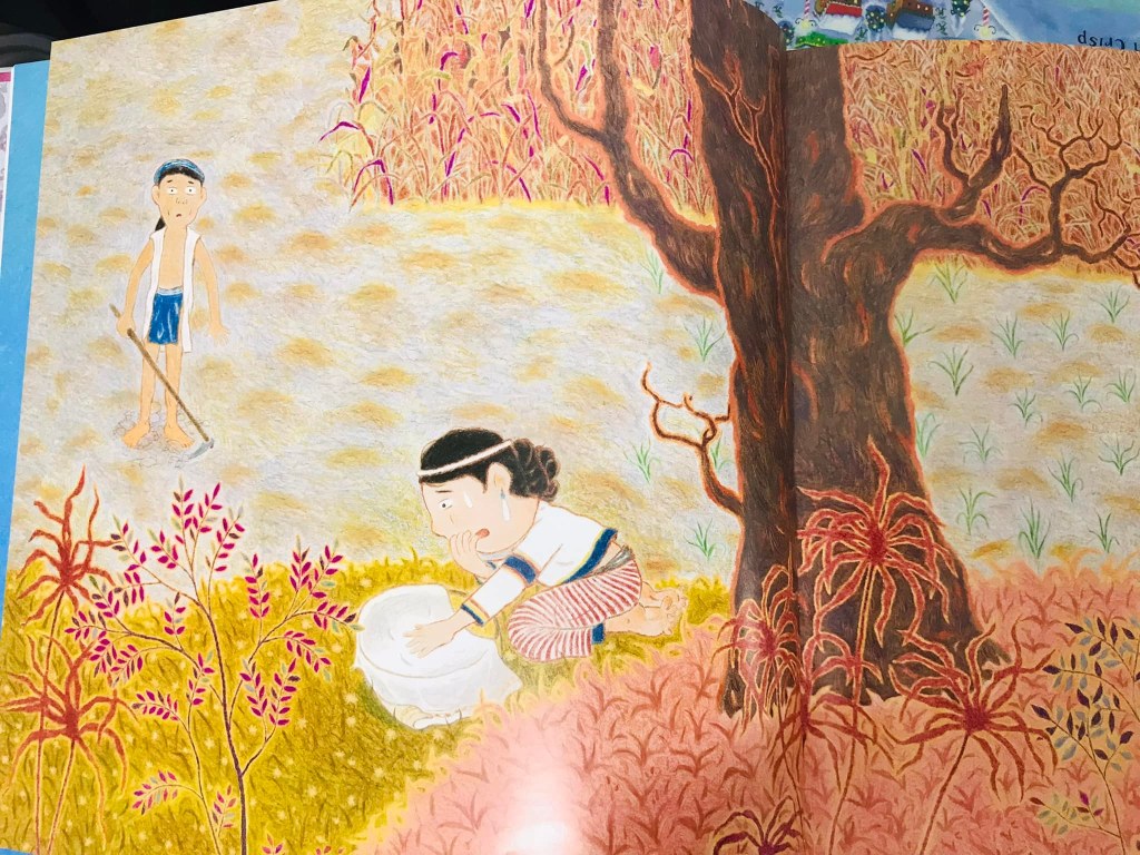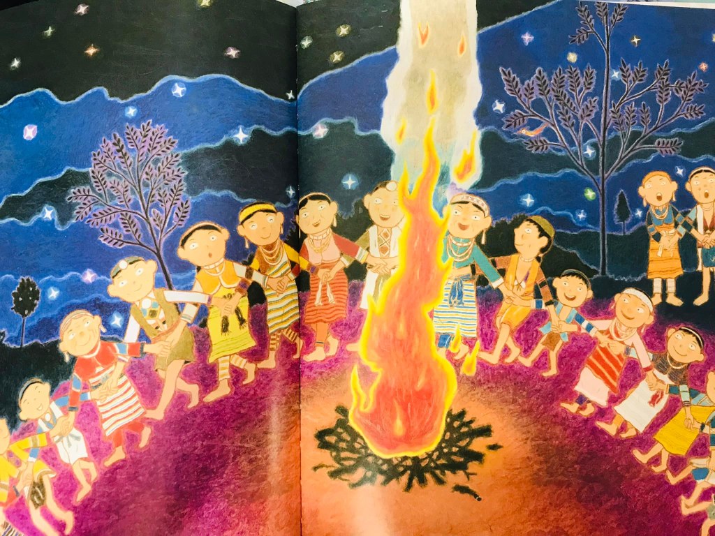 此时,灵鸟建议巫婆带着大家一起唱歌跳舞,吸引金太阳的好奇心。金太阳探出头,发现外面祥和宁静,就安心的继续在天空发光发热。从此,族人们又恢复平静快乐的日子。