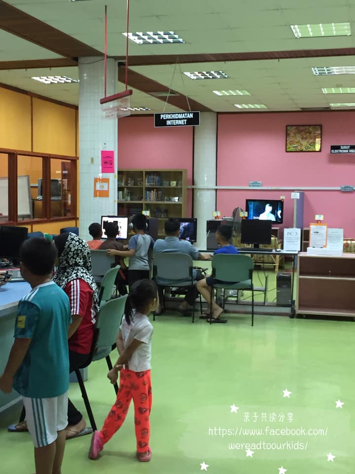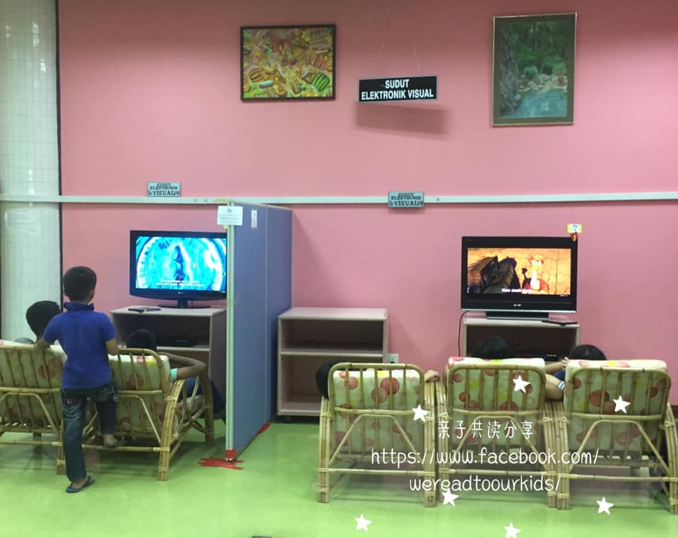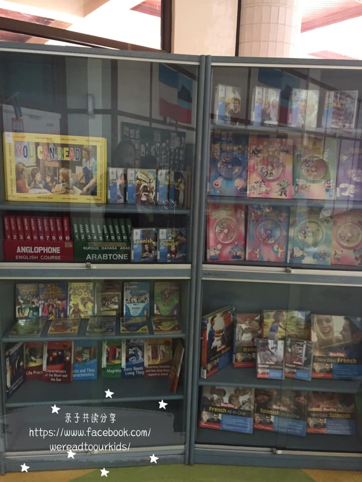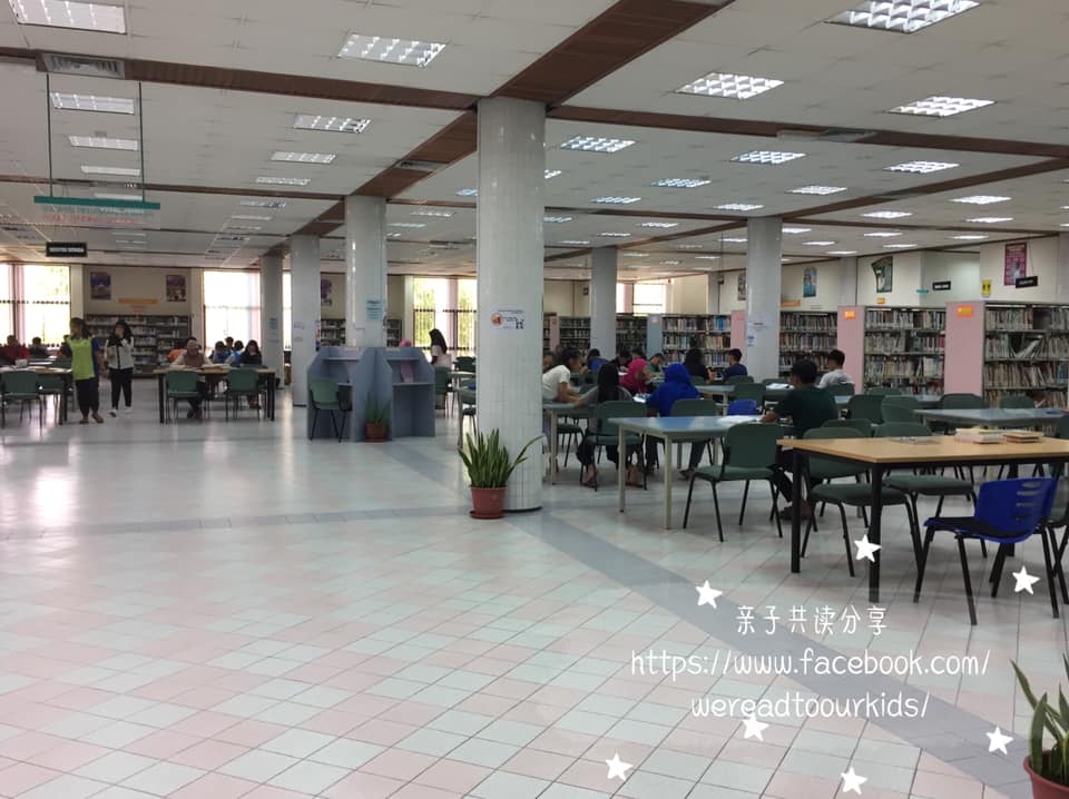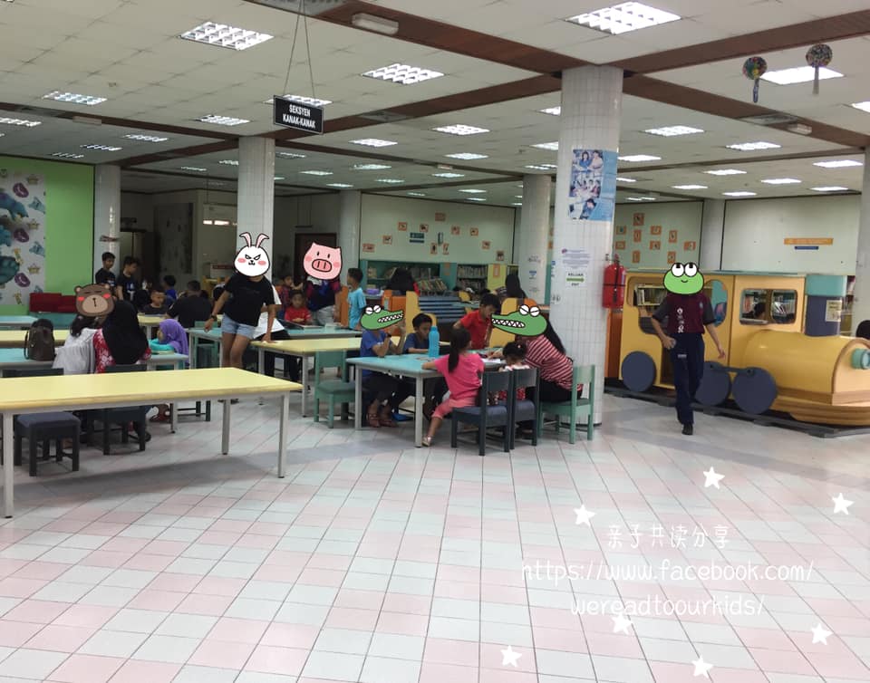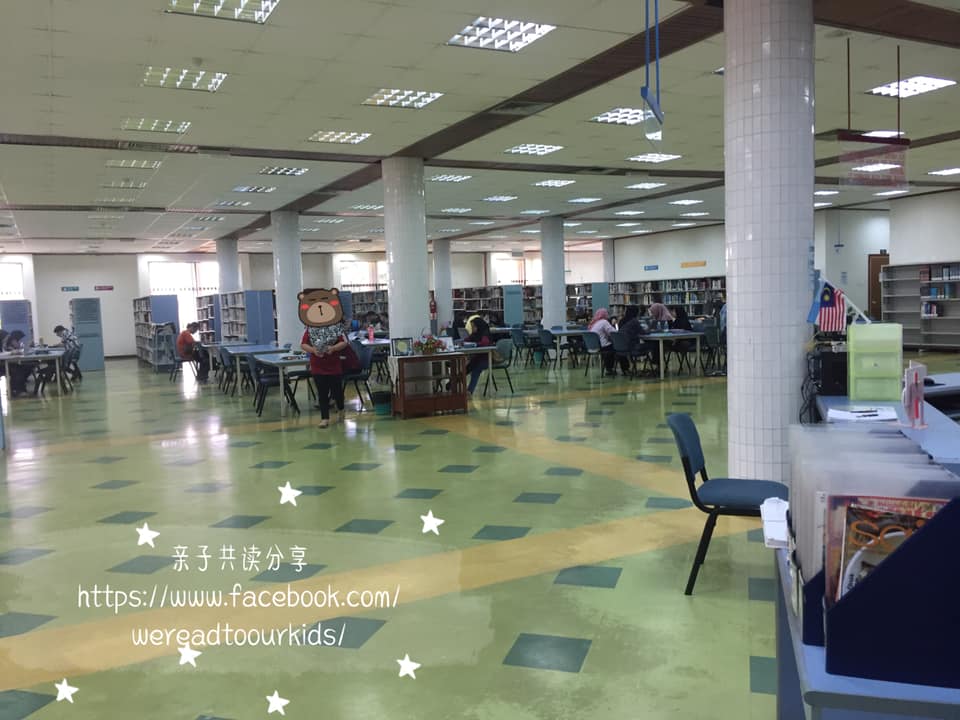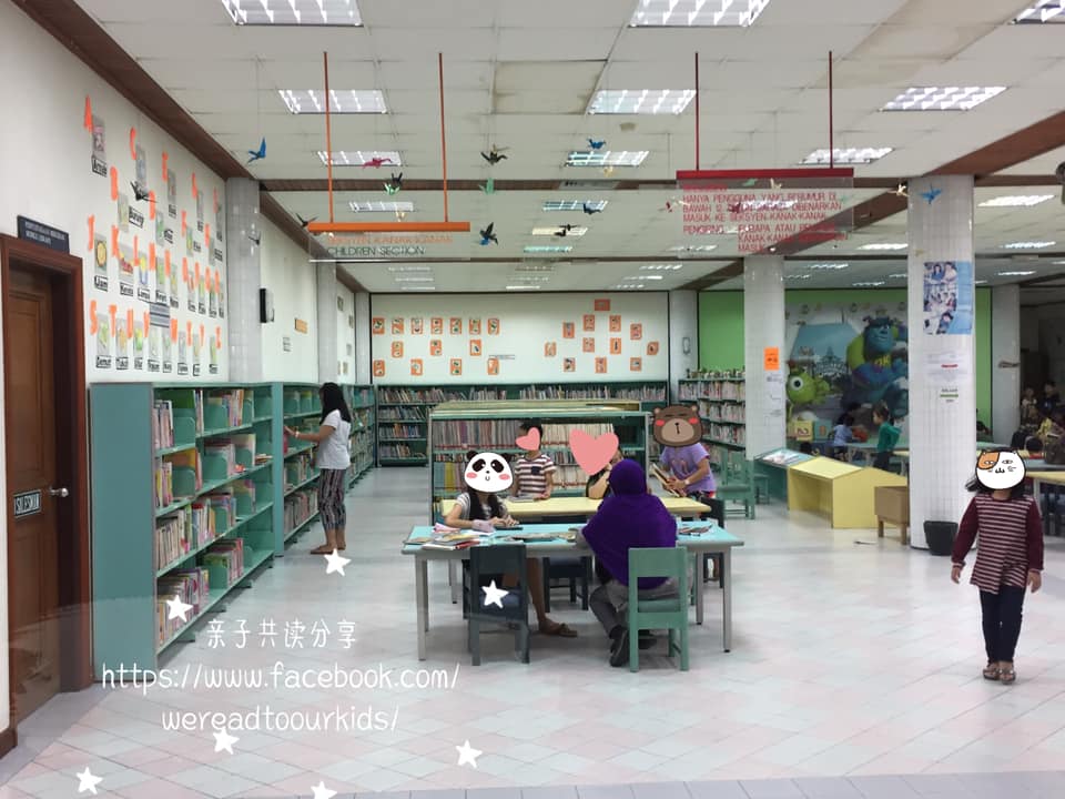 进馆五分钟后,我其实就想走了,但念头一转,反正已经来到,不如拍些照片作为参考资料。就在这时,我发现了两本彼得布朗的《老虎先生来撒野》英文精装版。接着,我又陆续发现了《The Day the Crayons Quit》,《Goodnight Moon》等等比较出名的绘本还有整套Dr. Seuss系列。随手翻了几本没听过的,内容都还不错。就这样,我开始认真地把每个书柜看了一遍,在一个名叫Folio的区域找到一堆Usborne 参考书(就是动不动叫价一、两百马币,平时只能观望舍不得买的那种)。还有一些本地中英文的双语绘本,从图画到故事都有让我小惊艳了一下。在忙着挖宝的当儿,眼角瞄到一对父女盘坐在地上,女孩大概6、7岁,正认真地朗读一本英文图书,碰上不懂的字,父亲和蔼地从旁教导。拍照前本该跟人家打声招呼,但又不想破坏这美丽的一幕,结果还是偷拍了(错误示范!)。 捞宝完毕,在一旁与儿子共读的多爸喜滋滋地宣布,给孩子办张会员卡吧,这里的英文书不错啊!大概是看我最近又入手了一堆英文书,多爸看到保住荷包的契机了。友善的图书馆员告知,现在图书馆是采取无卡制,只需要用mykid注册,是免费的,孩子可以借六本书,四个星期的期限,能上网续借。整个注册过程不到5分钟就完成了。