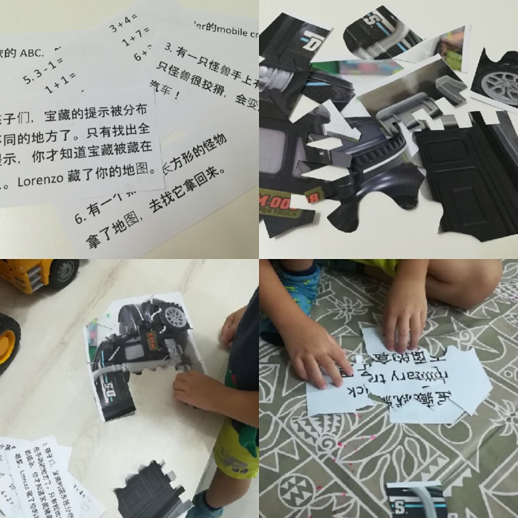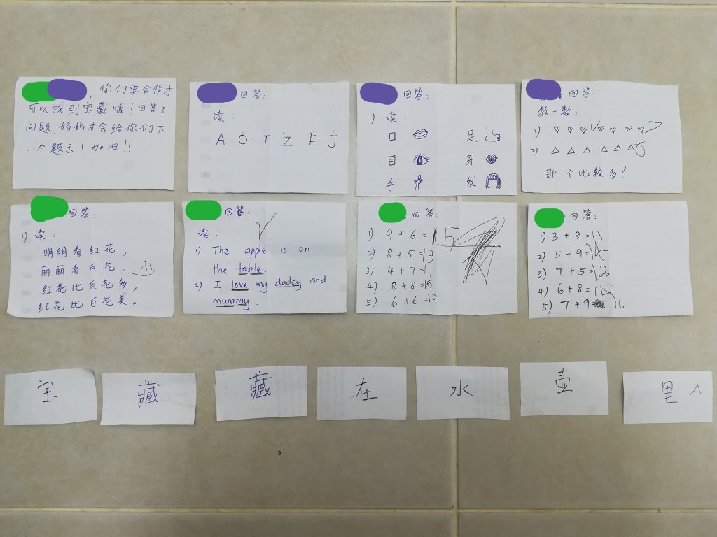 藏宝图被切开几张和放在不同的地方。孩子跟着题目去找藏宝图,把宝藏图拼好才能找到藏宝地点。