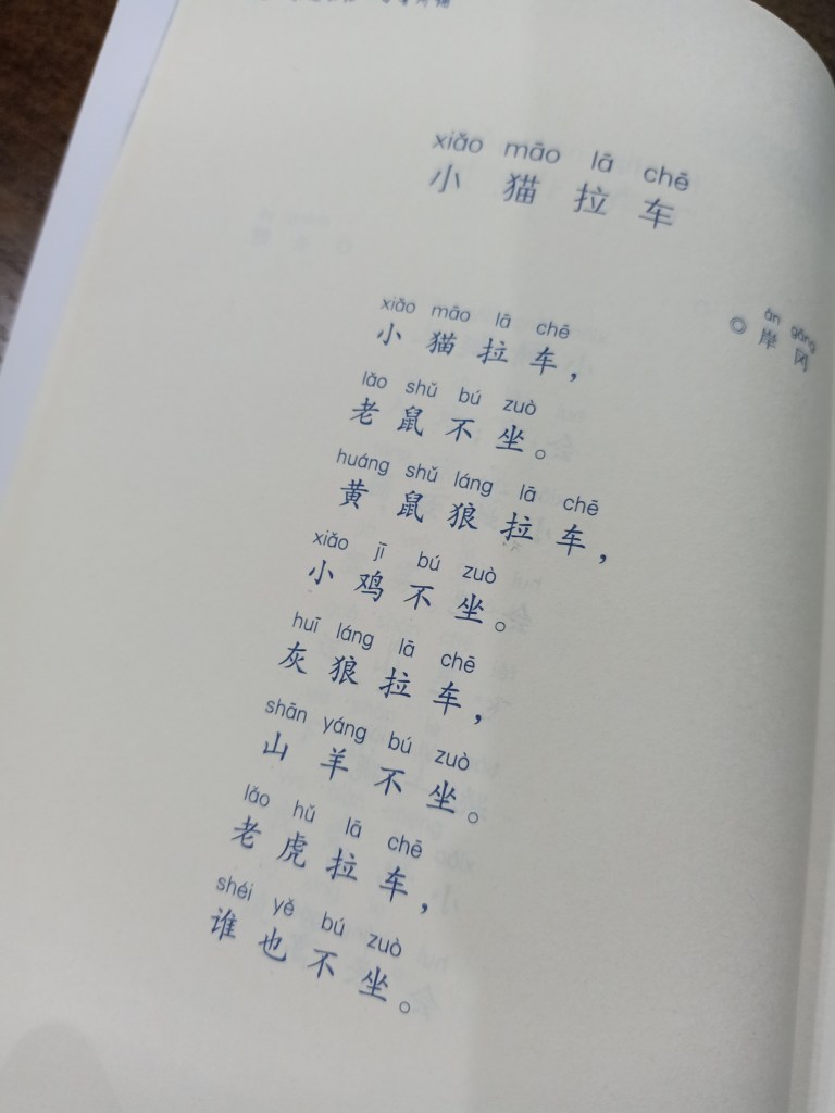 解释了第一段,为什么老鼠不坐小猫拉的车后,孩子眼睛一亮,继续自己读。除了“谁”,全都读对了。他非常喜欢这首,觉得很有趣。