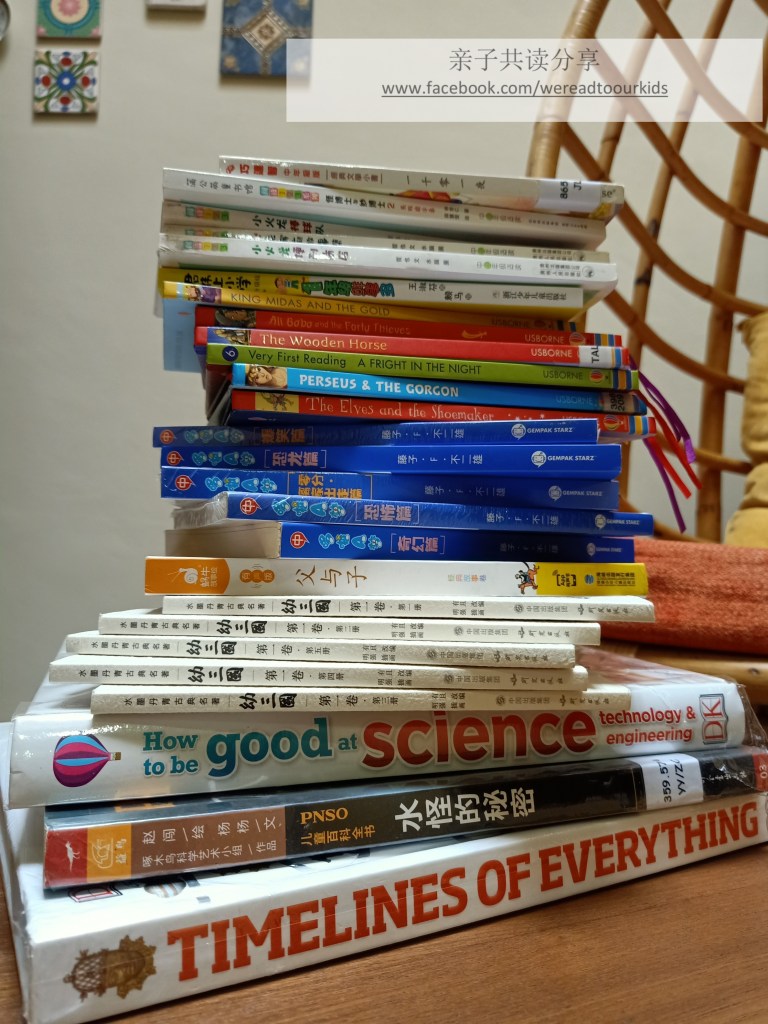 以上分类,中英文适用。英文书籍完全没问题。中文书籍除了漫画,还找不到符合孩子目前识字量又好看的分级读物。马来文呢。。。程度还离阅读好远好远,除了尽量跟上学校教科书,偶尔成功说服他看最简单的国语图书以外,目前只有两个字总结,“没辙”😅