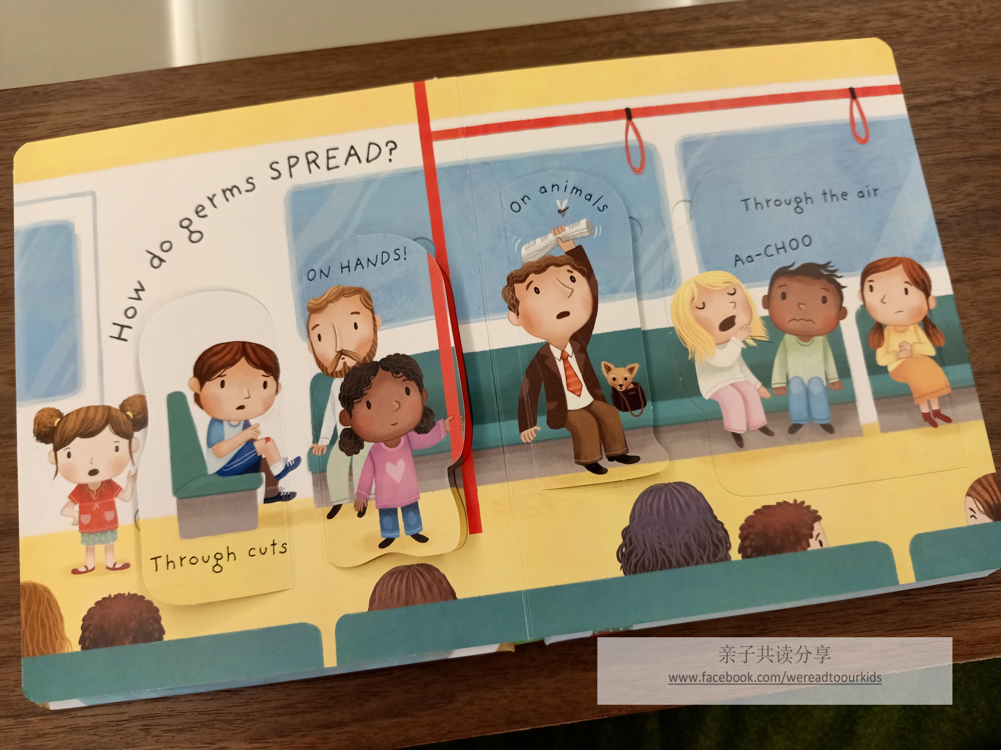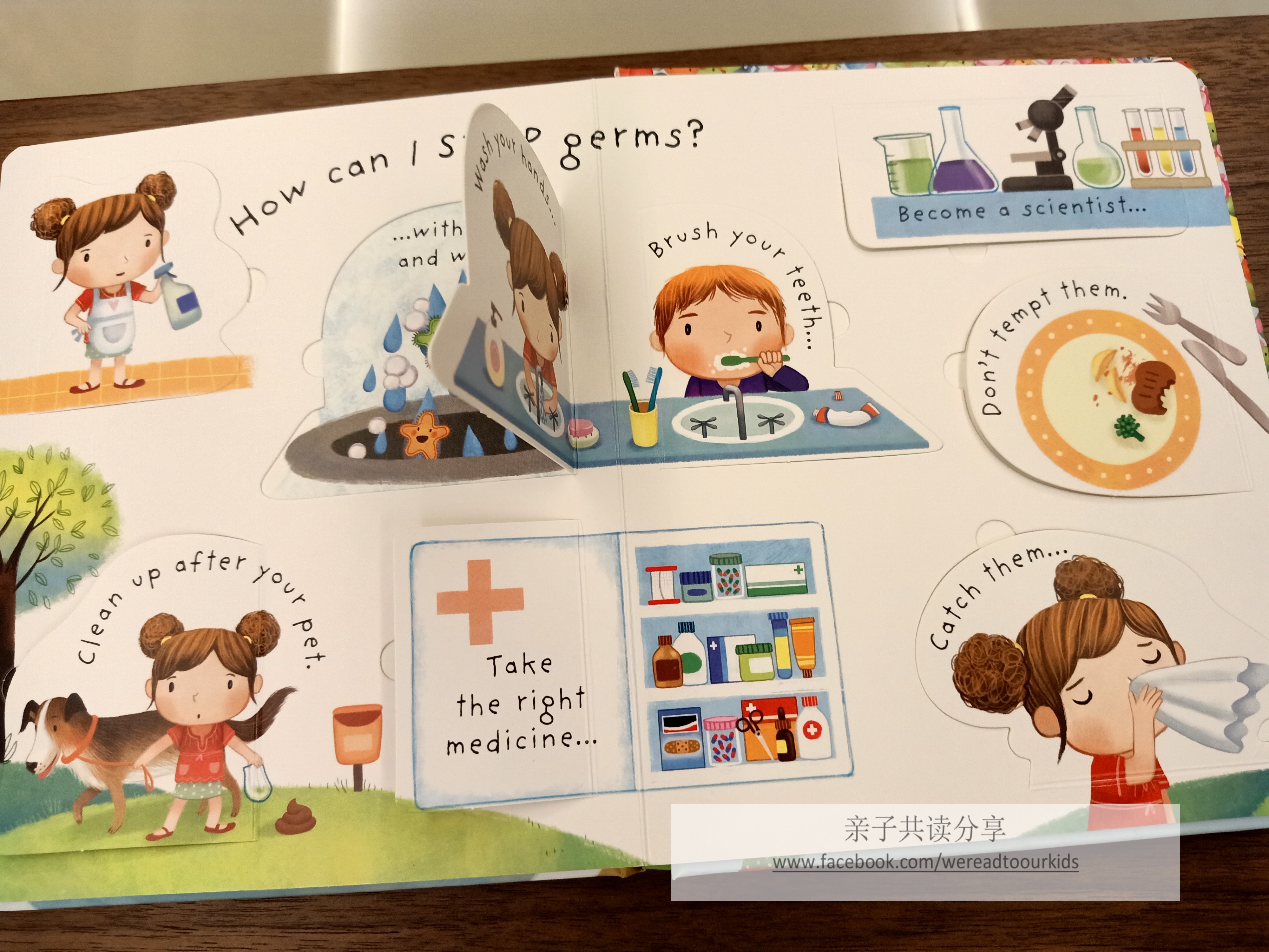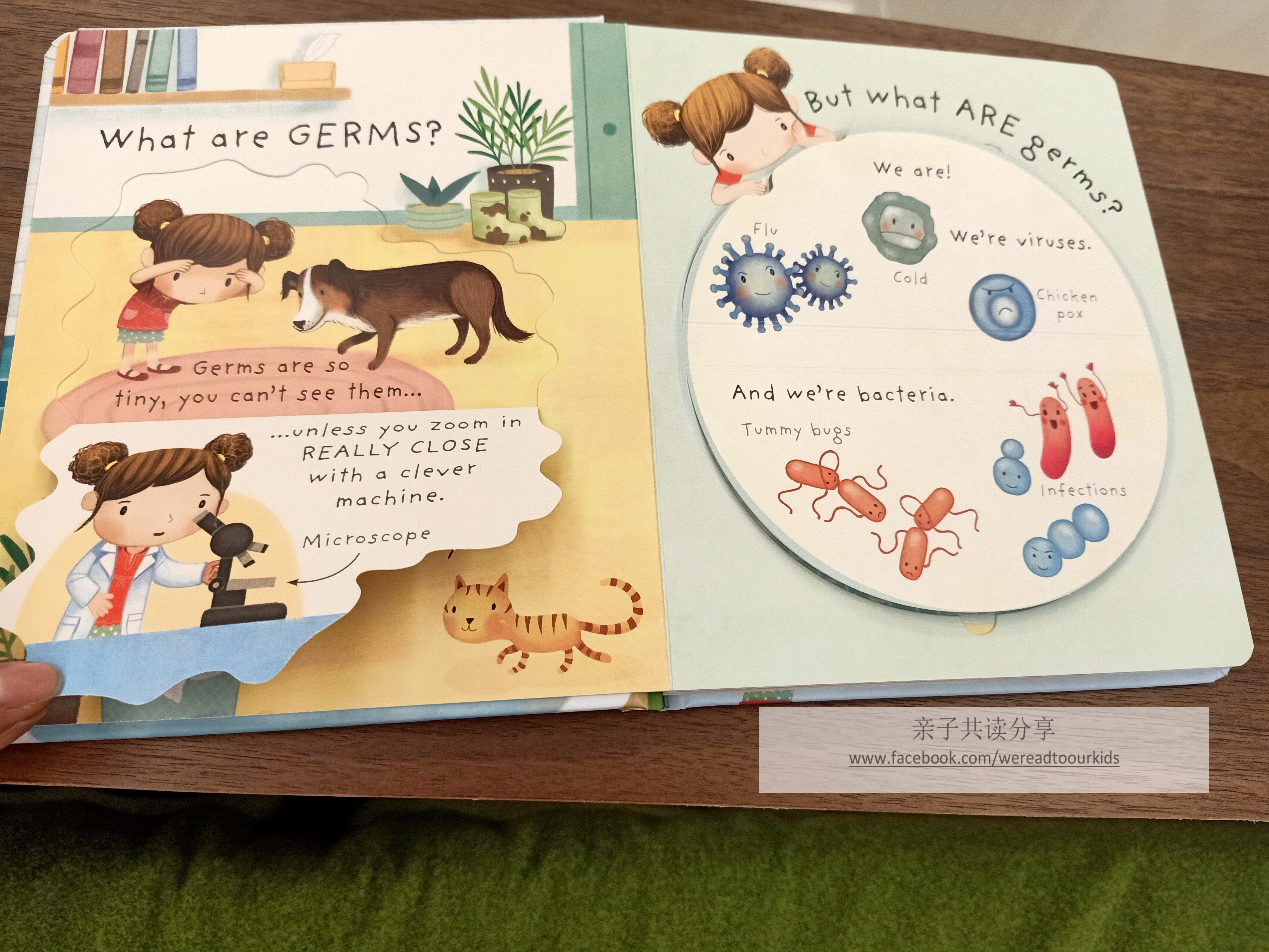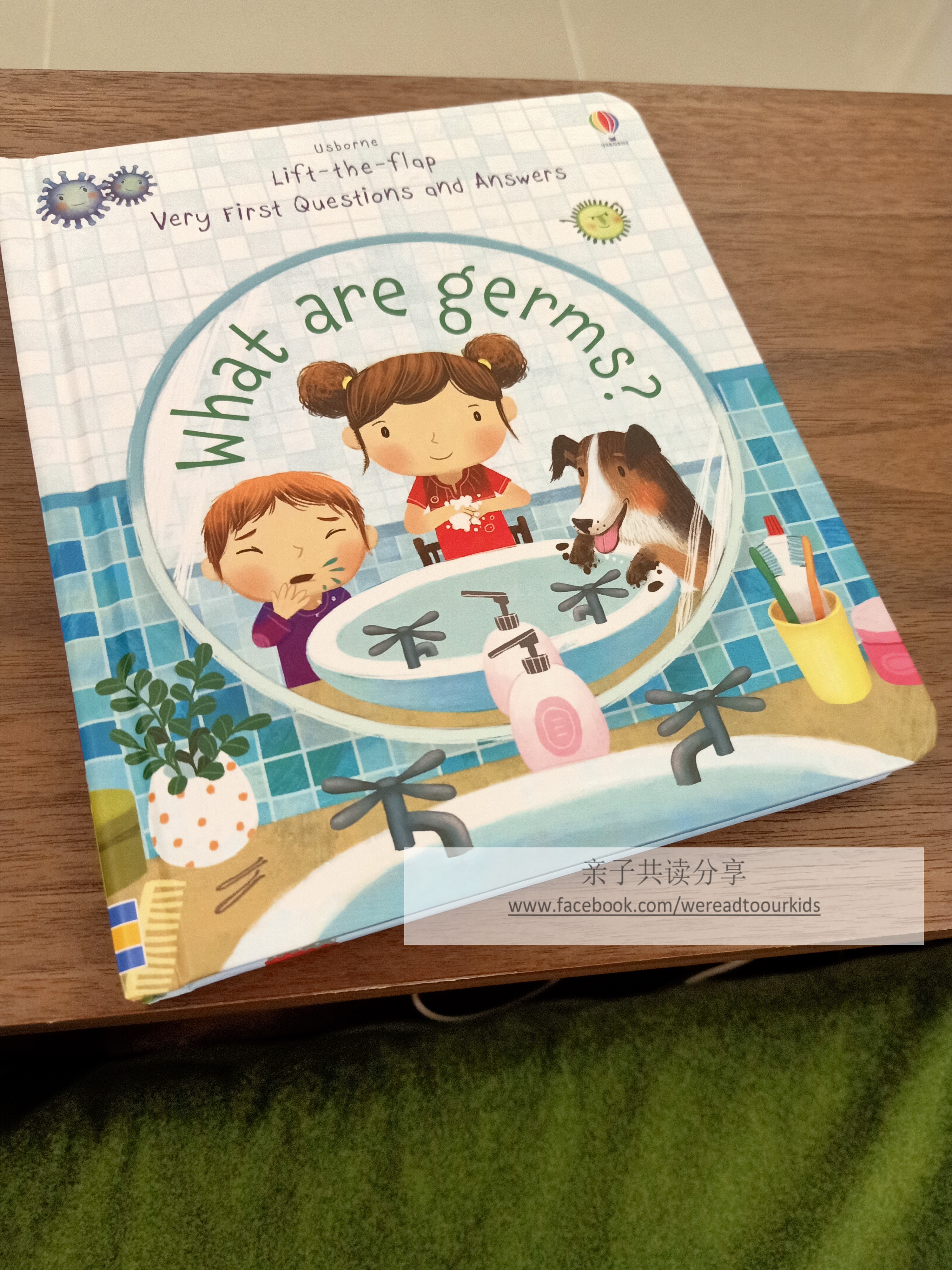大概两年前多多突然变得爱把手指放进嘴巴,小肠还因此遭到细菌感染狂呕几天后被逼住院打点滴抗生素。病好后这个坏习惯一直不改,逼得我有一段时间,一旦发现他忘记又重犯,当天就只能共读《What are germs?》这本Usborne 翻翻书。通过简单的图画、文字,让他从科学角度了解病毒病菌,以及为什么一定要勤洗手。