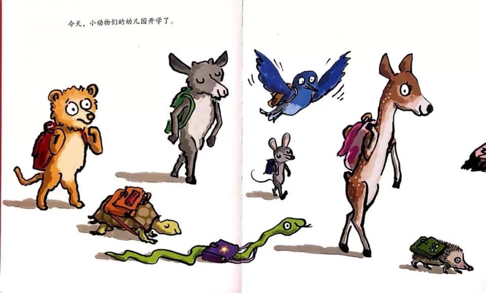 故事从每个动物背着书本去上学开始,比较有趣的是大家都背书包(火烈鸟、树懒、蜗牛