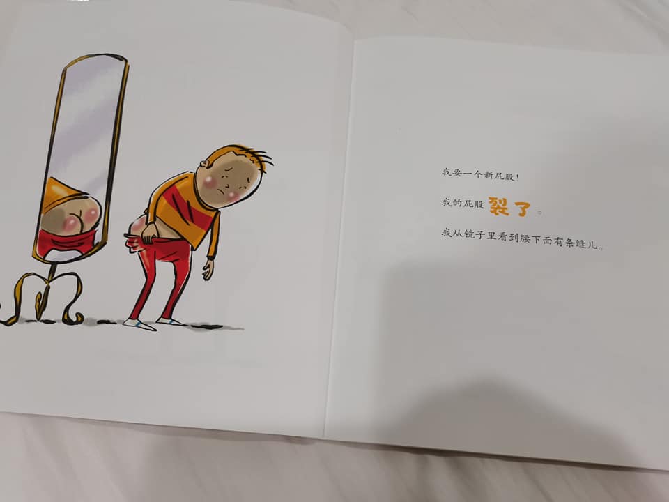 这是一个关于换屁股的故事。小男孩想要一个新屁股,因为他的屁股裂了。他从镜子里看到要下面有条缝儿。故事里的男孩配上了天马行空的新屁股,非常有想象力。