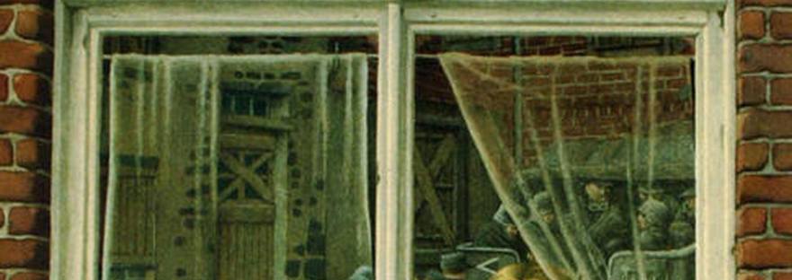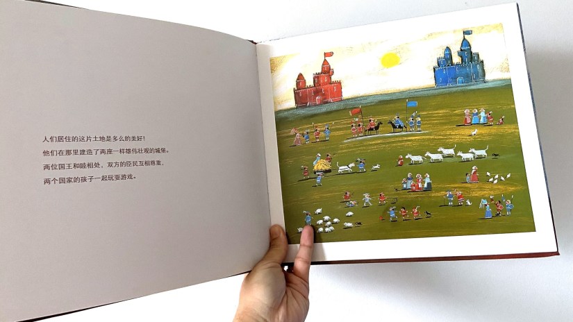 繪本裡的繪圖稚氣,猶如小朋友的筆觸。圖里的人物、建築物、動物好像積木一樣,被搬來搬去,就用了兩種顏色來區分兩國的人。人物雖小,但人物的動作和表情還是相當的細膩,顏色會給你不同的氛圍和感覺。