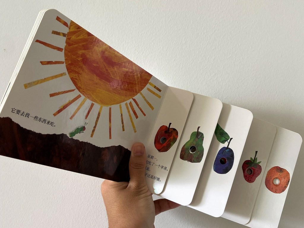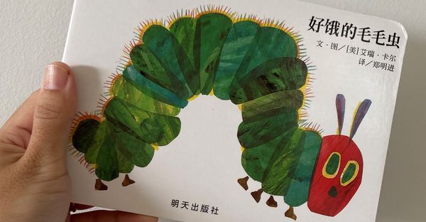 故事里的毛毛虫蜕变之前,肚子好饿好饿,吃了好几种不同的水果,先是苹果、梨、李子、草莓、橘子、之后还吃了好多好多看起来美味可口的食物。虽然腌黄瓜不是亚洲餐桌上常见的食物,不过我们也能借机介绍给小朋友认识认识。毛毛虫吃的食物里大多数都是小朋友爱吃的,不过它吃多了导致肚子不舒服,最后吃下一片叶子才没事。随着毛毛虫逐渐长大,它给自己造了房子叫做“茧”,两个星期后变成了一只漂亮的毛毛虫。