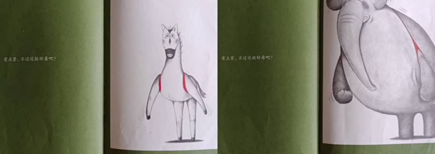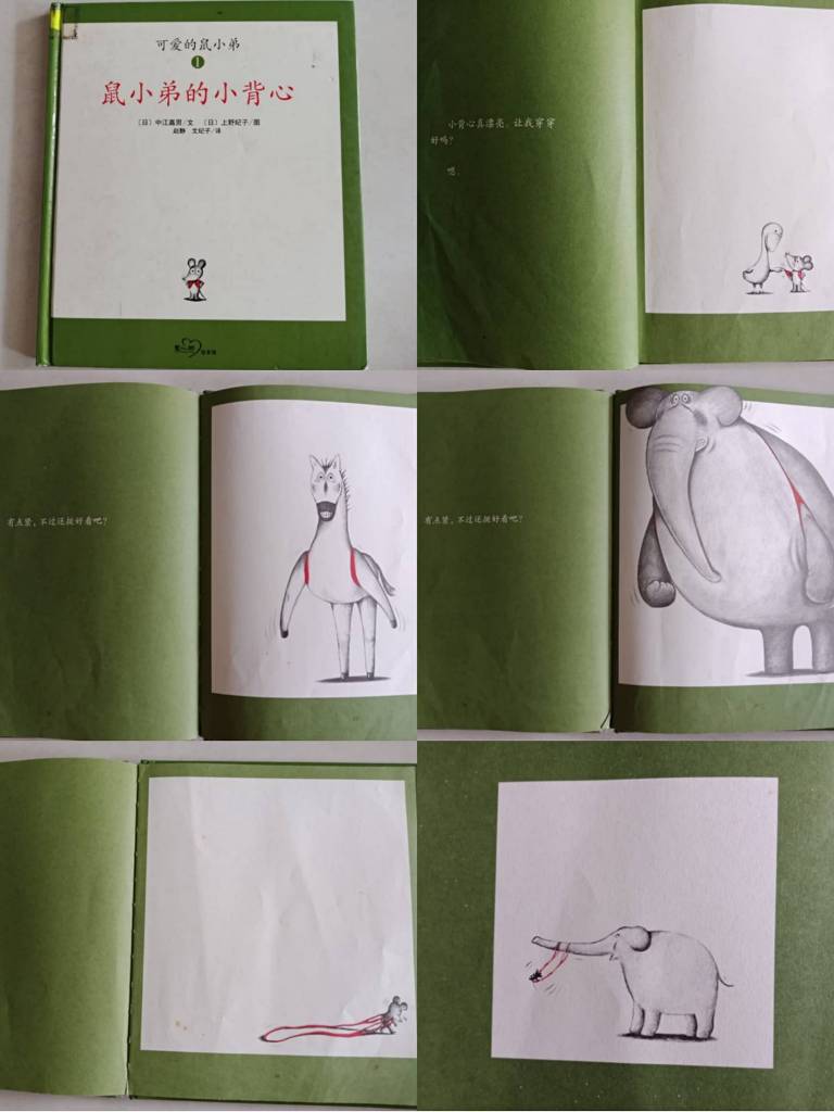 故事一直重复,但是出场的动物却越来越大只,每一只动物穿了背心后都说了同样的一句话。看到大象穿那小背心,我家兄弟俩真的是笑翻了天。可是,当鼠小弟拖着它那被撑大了的小背心时,兄弟俩也跟着失落了,弟弟还说:“它没有妈妈织给他的小背心了咯。”