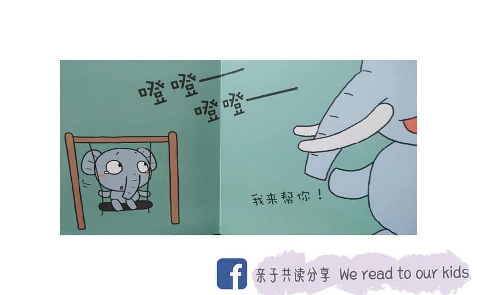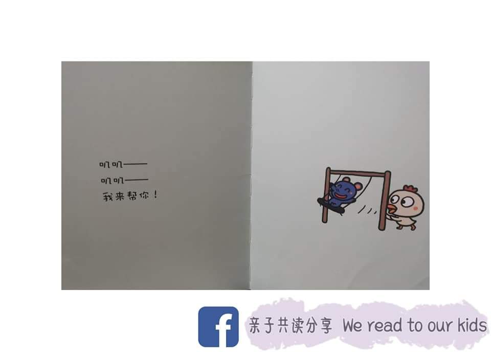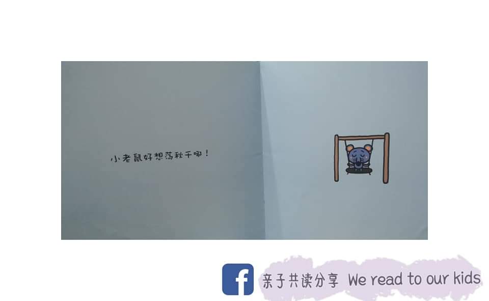 绘本从一只小老鼠开始,独自一个是很难把秋千荡起来(老鼠脚短🤣),于是会有另一只大一些的动物过来帮忙推一把。故事就是这样从最小的动物说到最大的动物,而最大的动物要由谁来帮忙呢?