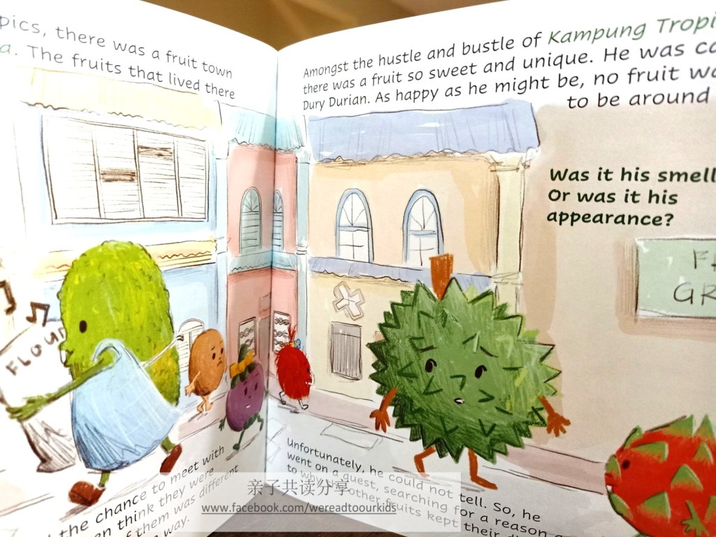 翻阅这本绘本,那份熟悉感亲切感油然升起。除了故事主角是榴莲以外,其他角色都是以马来西亚热带水果出现:山竹、人参果、红毛丹、火龙果、杨桃、莲雾、Cempedak。故事幽默可爱之余,插画排版也相当有水准。
