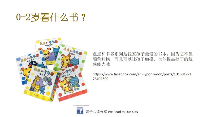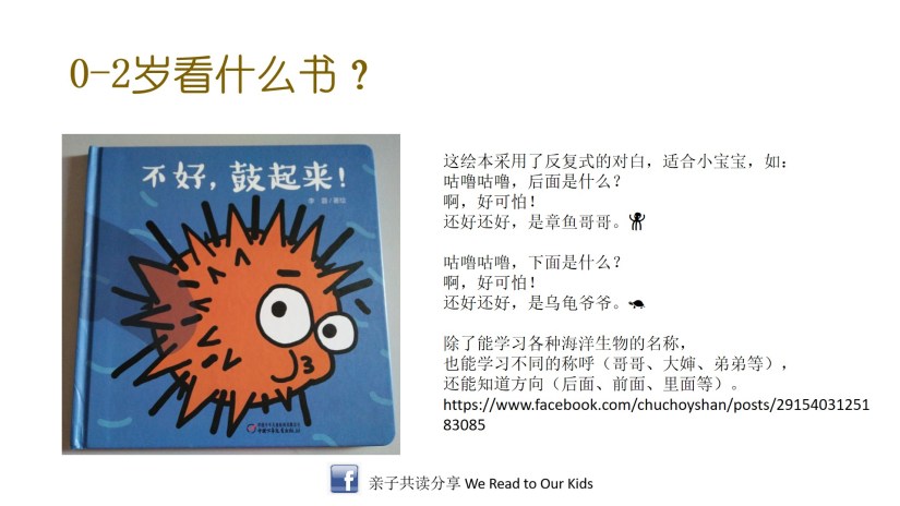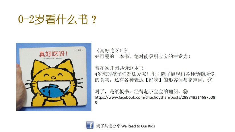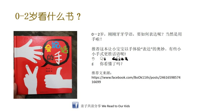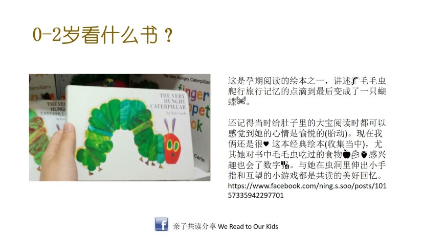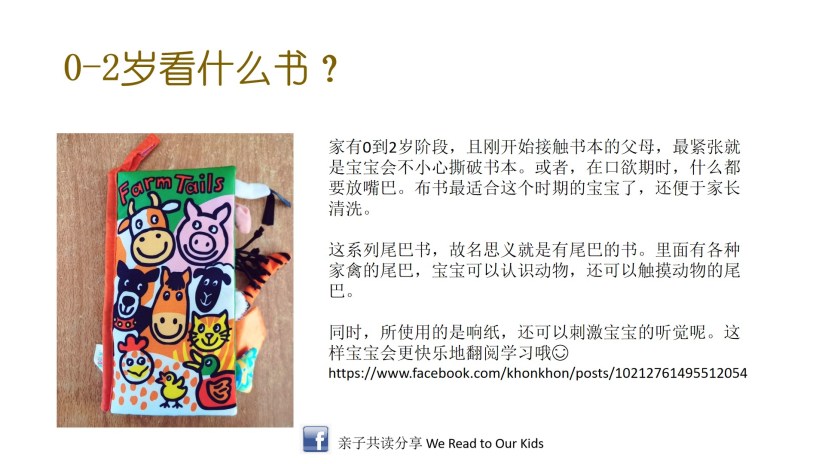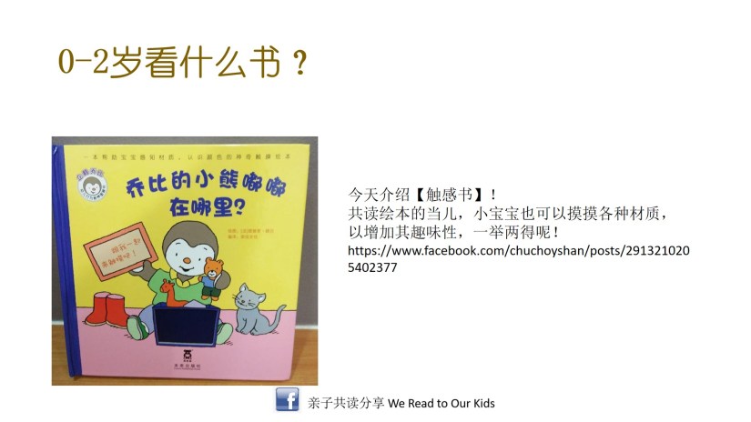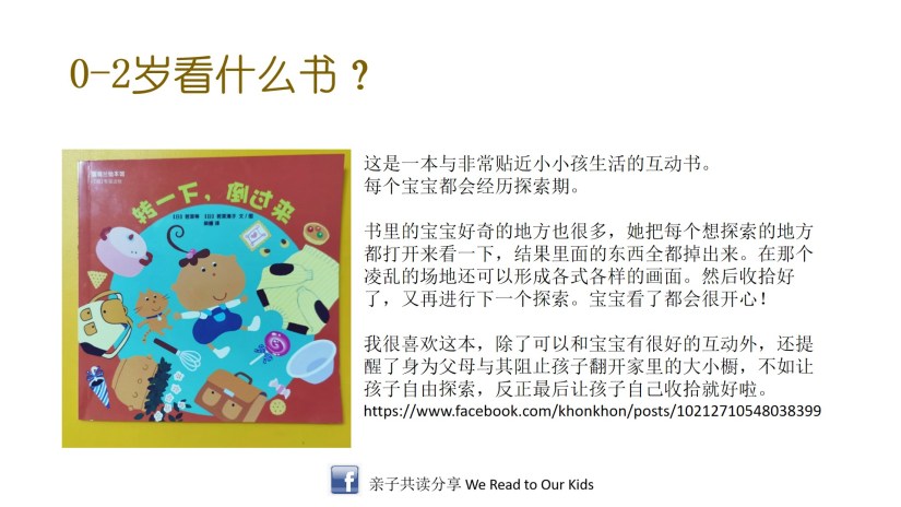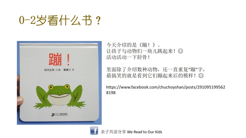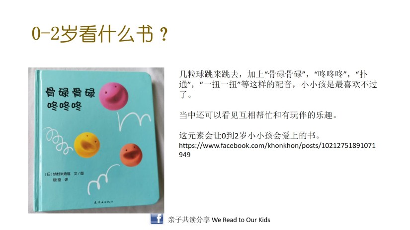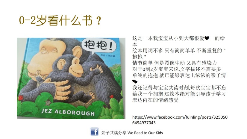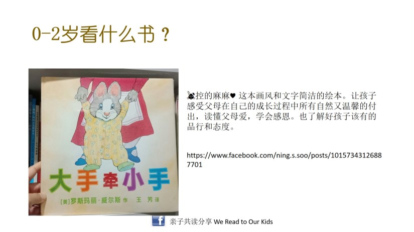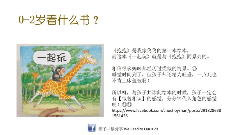 对于小宝宝来说,边翻书边哼唱,是很有吸引力的。首先爸爸妈妈的声音对他/她来说既熟悉又亲切,即使五音不全,听在宝宝耳里却是绕梁三日的优美声音。拿着书本唱,可以让他同时从歌声和图画得到适量的感官刺激。如果加上动作,摆摆手,扭扭腰,孩子还可以训练大肌肉运动技能。
