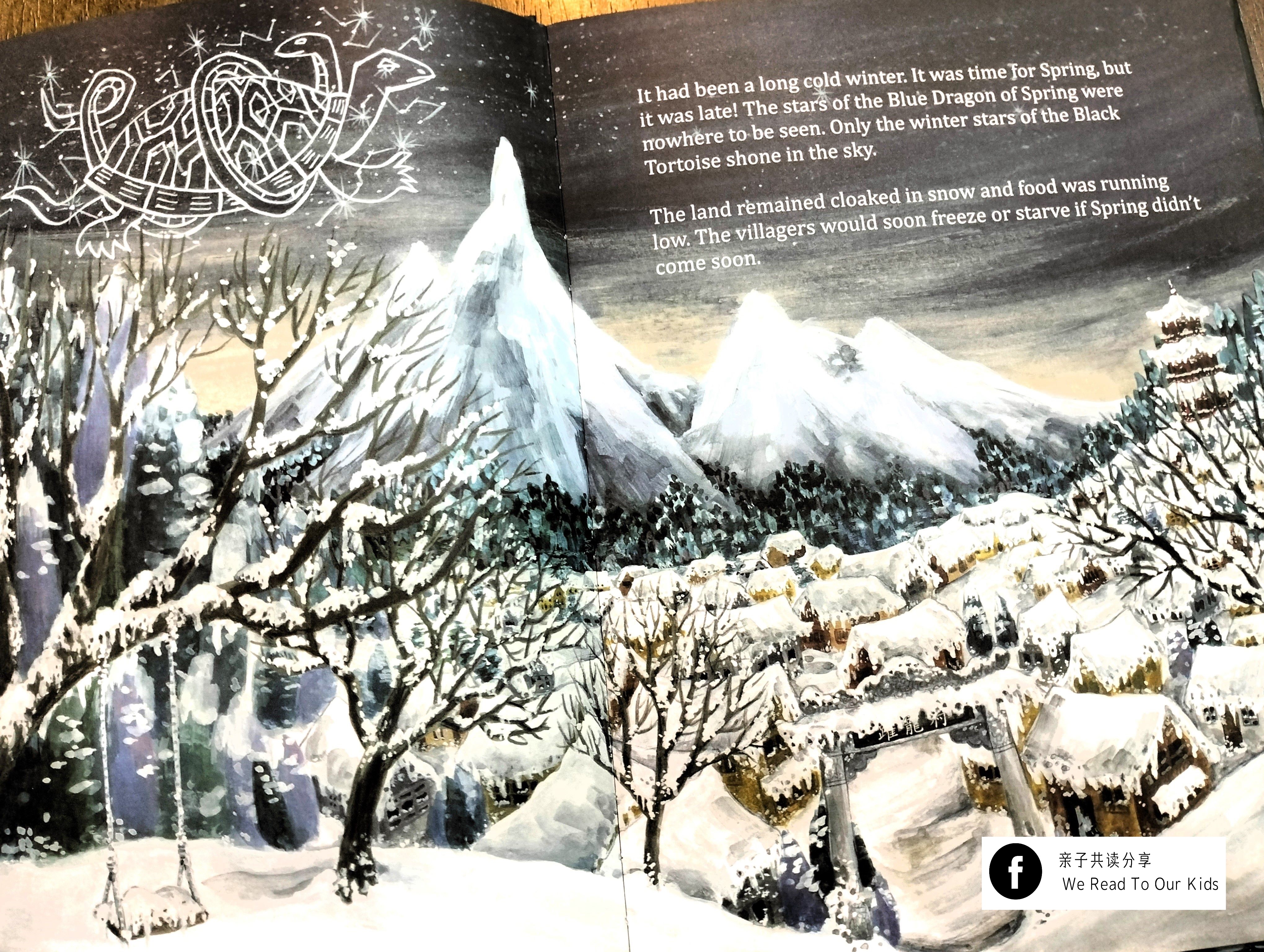 书中一开始提到的Black Tortoise,就是中国神话中天之四灵:青龙、白虎、玄武和朱雀中的玄武。代表的季节是冬季,代表的颜色是黑色。作者很贴心地加注四灵的解释。因此即便读者对中国神话是零概念,还是能够理解绘本的背景故事。